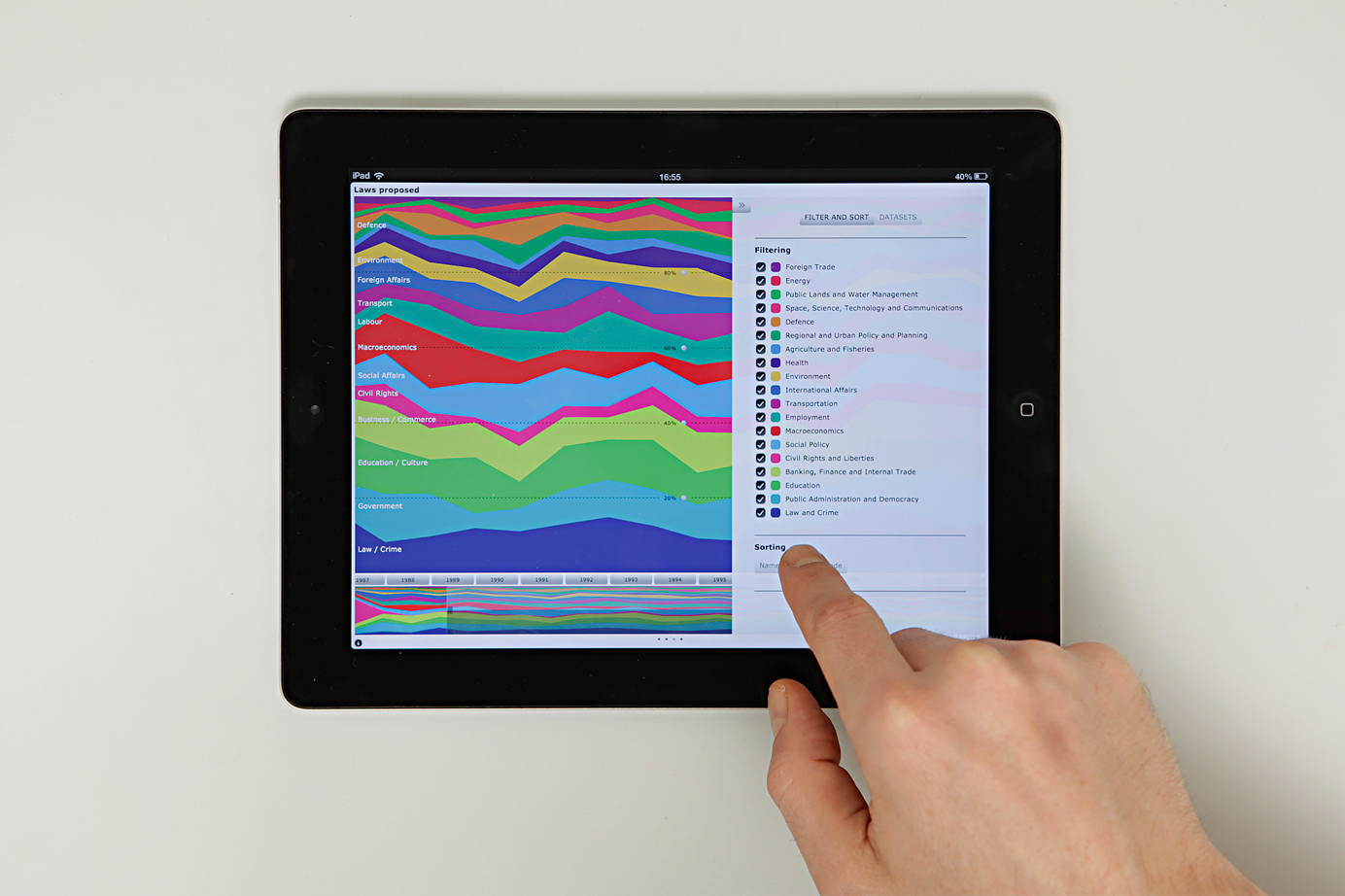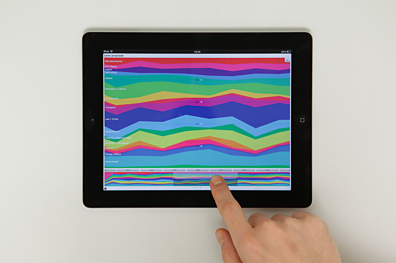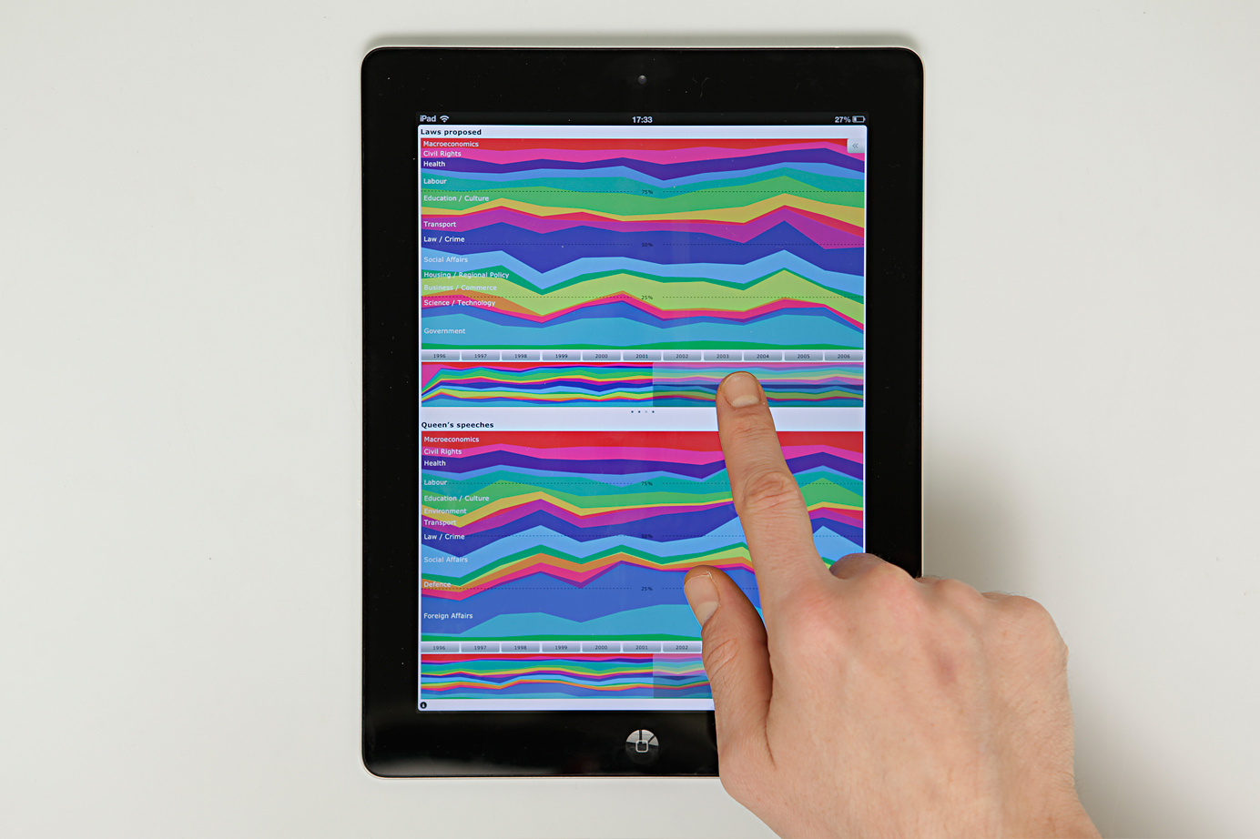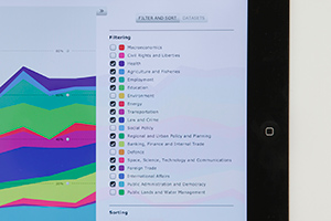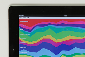 The interactive visualization is optimized for iPad and uses the form of a stacked area chart to show the attention put to relevant social issues. It allows to explore how trends surface in the political debate and develop over time. The display of the graph can be customized through a miniature timeline and an interactive control panel. Features include switching between data models and sources, sorting, filtering and zooming.