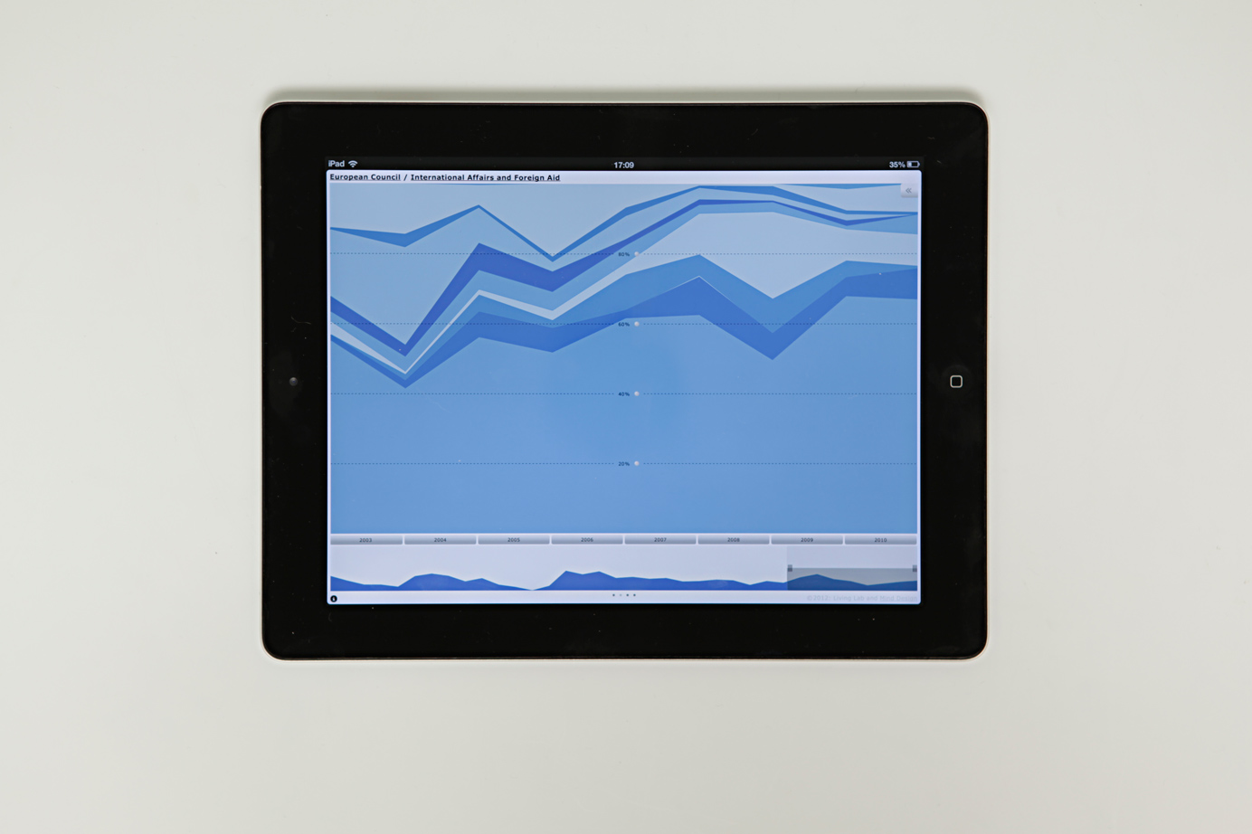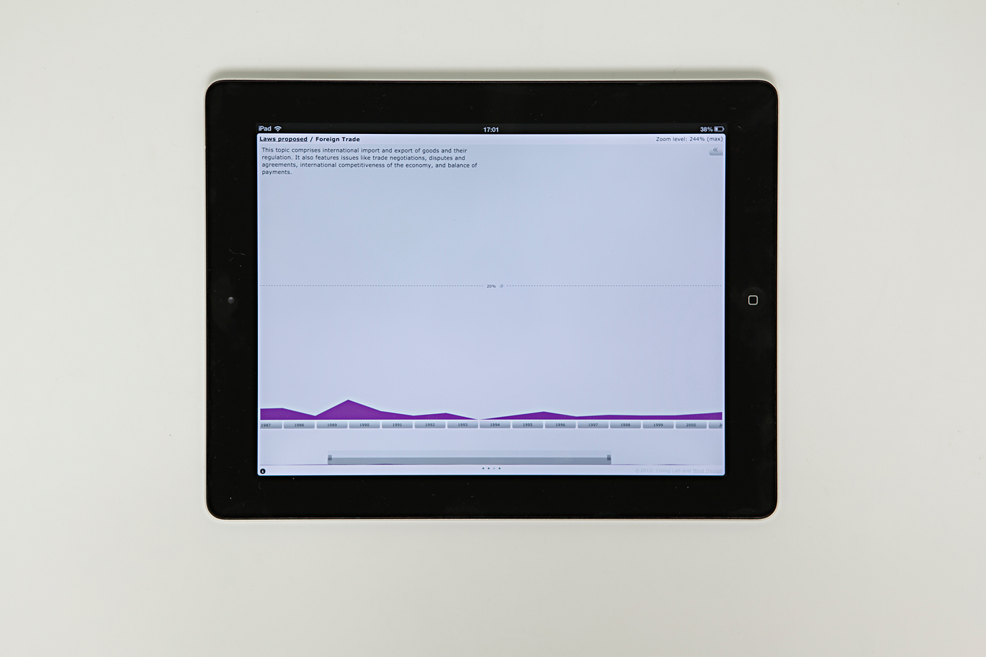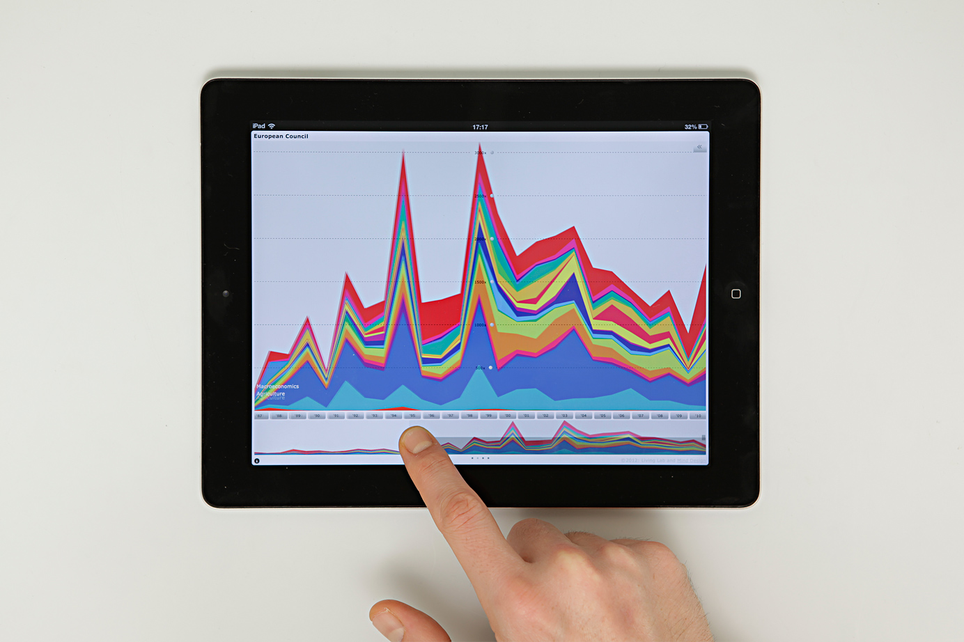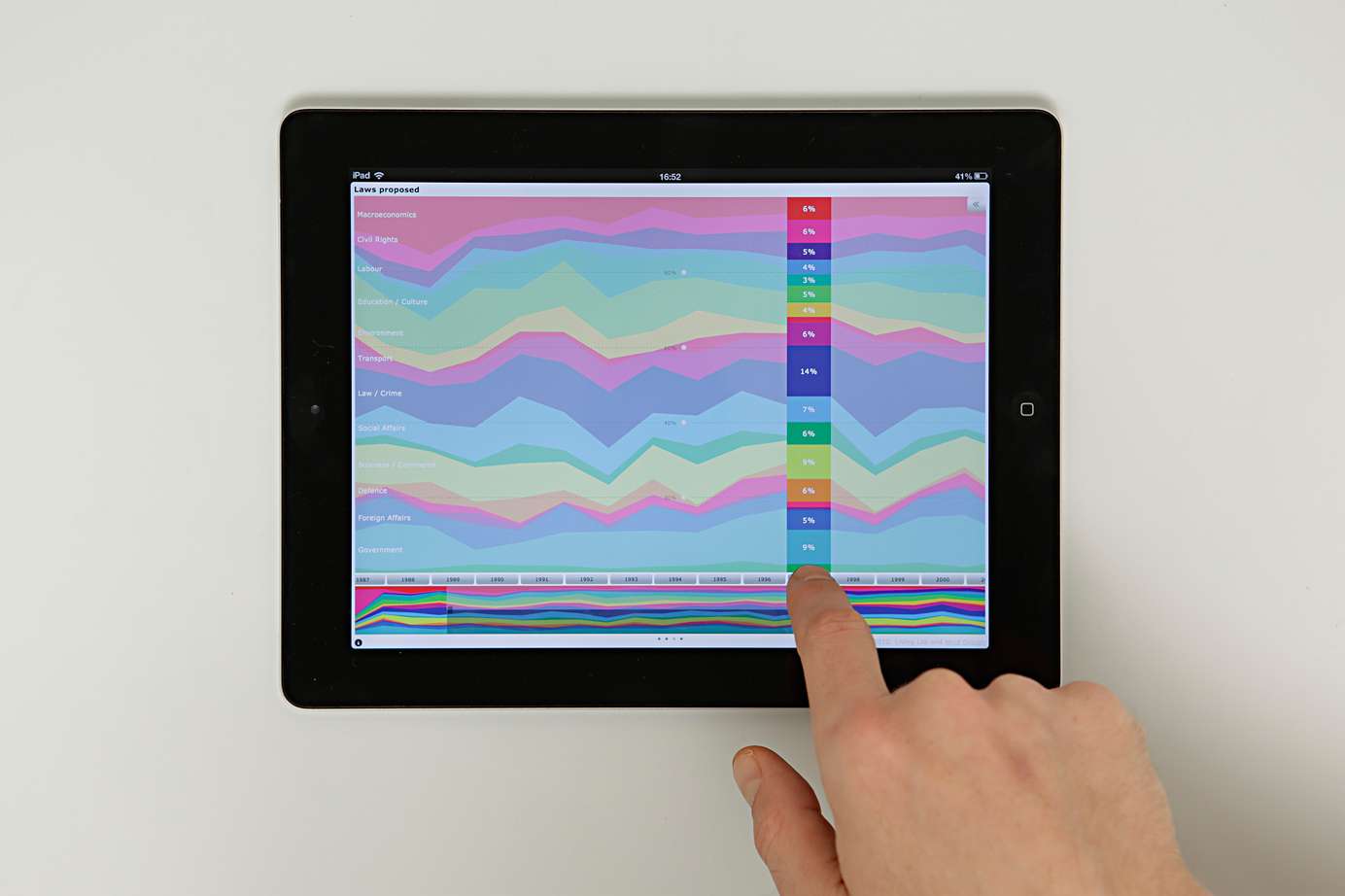 The interactive visualization is optimized for iPad and uses the form of a stacked area chart to show the attention put to relevant social issues. It allows to explore how trends surface in the political debate and develop over time. The display of the graph can be customized through a miniature timeline and an interactive control panel. Features include switching between data models and sources, sorting, filtering and zooming.