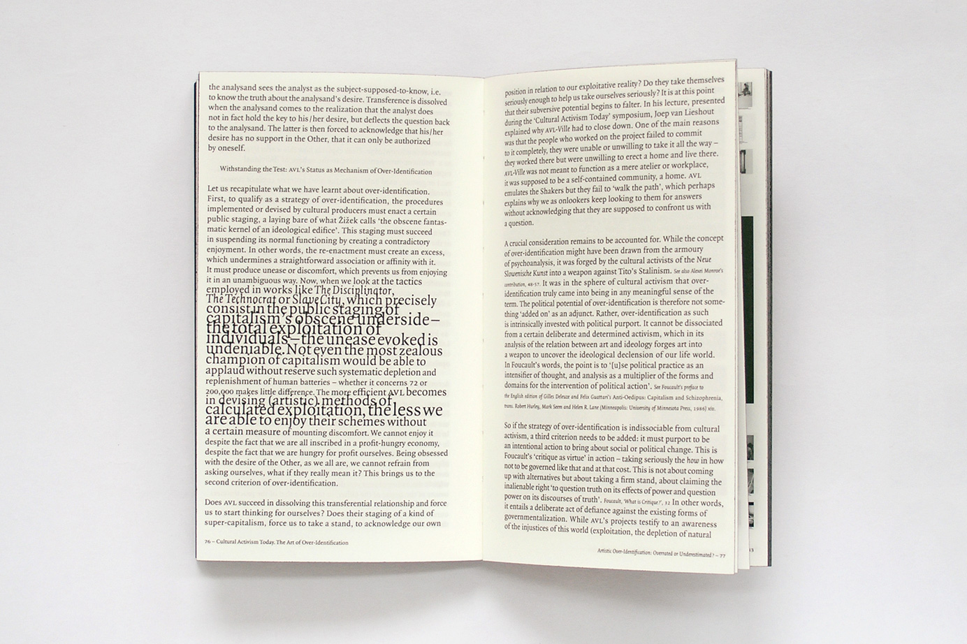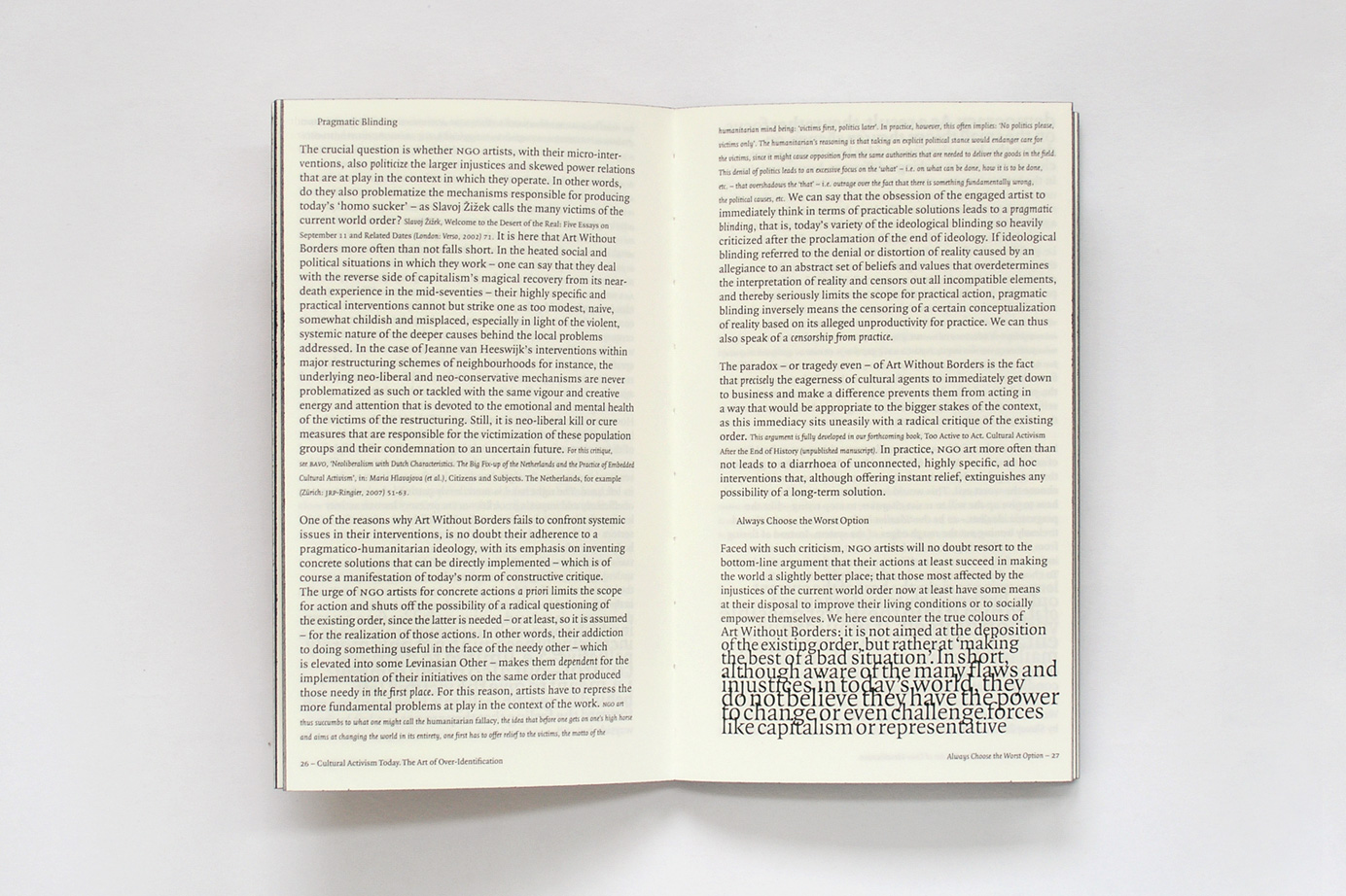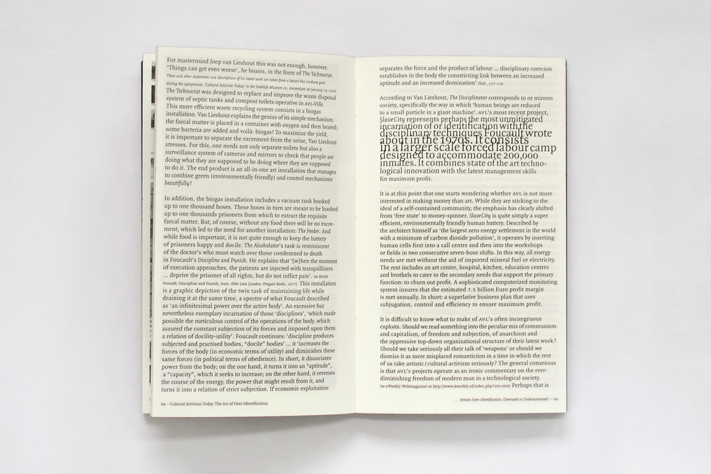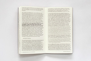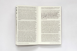 Cultural Activism Today is based on a symposium held at the Stedelijk Museum CS Amsterdam on January 18th 2006. The book contains generic text matter that fuses the characteristics of written word with acoustic attributes like creating visual sound waves through the font sizes that are based on the sine wave function. Printed text, increases according to relevancy here, given the context, it is intrinsically connected to hybrid text.