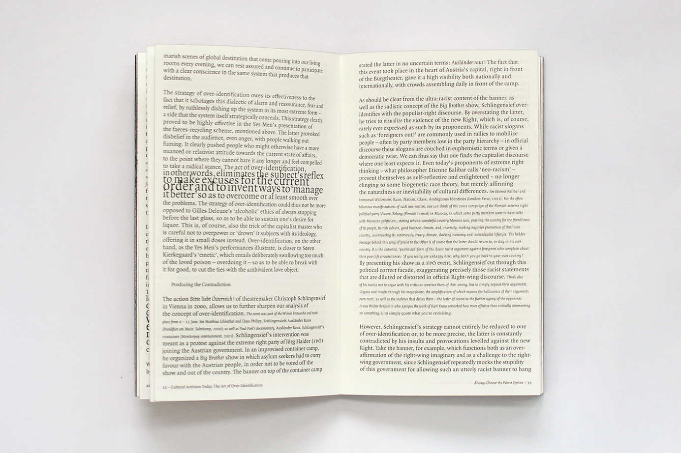 Cultural Activism Today. The Art of Over-Identification is a provocative intervention in the current debate where the effectivity of non-radical artistic statements is being considered. Released by Episode Publishers and launched on November 3rd 2007 at Witte de With in Rotterdam, Cultural Activism Today includes essays viscerally addressing performance, activism and contemporary pieces of art and and refers to works by Santiago Sierra, Christoph Schlingensief, Jens Haaning, Irwin, Laibach, Martijn Engelbregt, AVL and others.