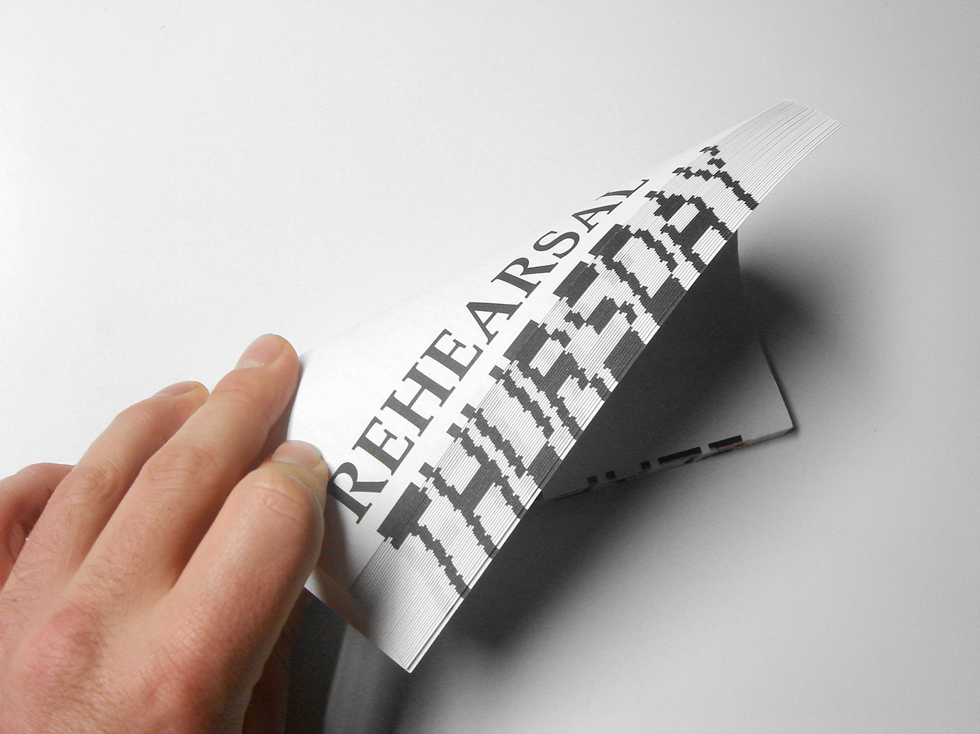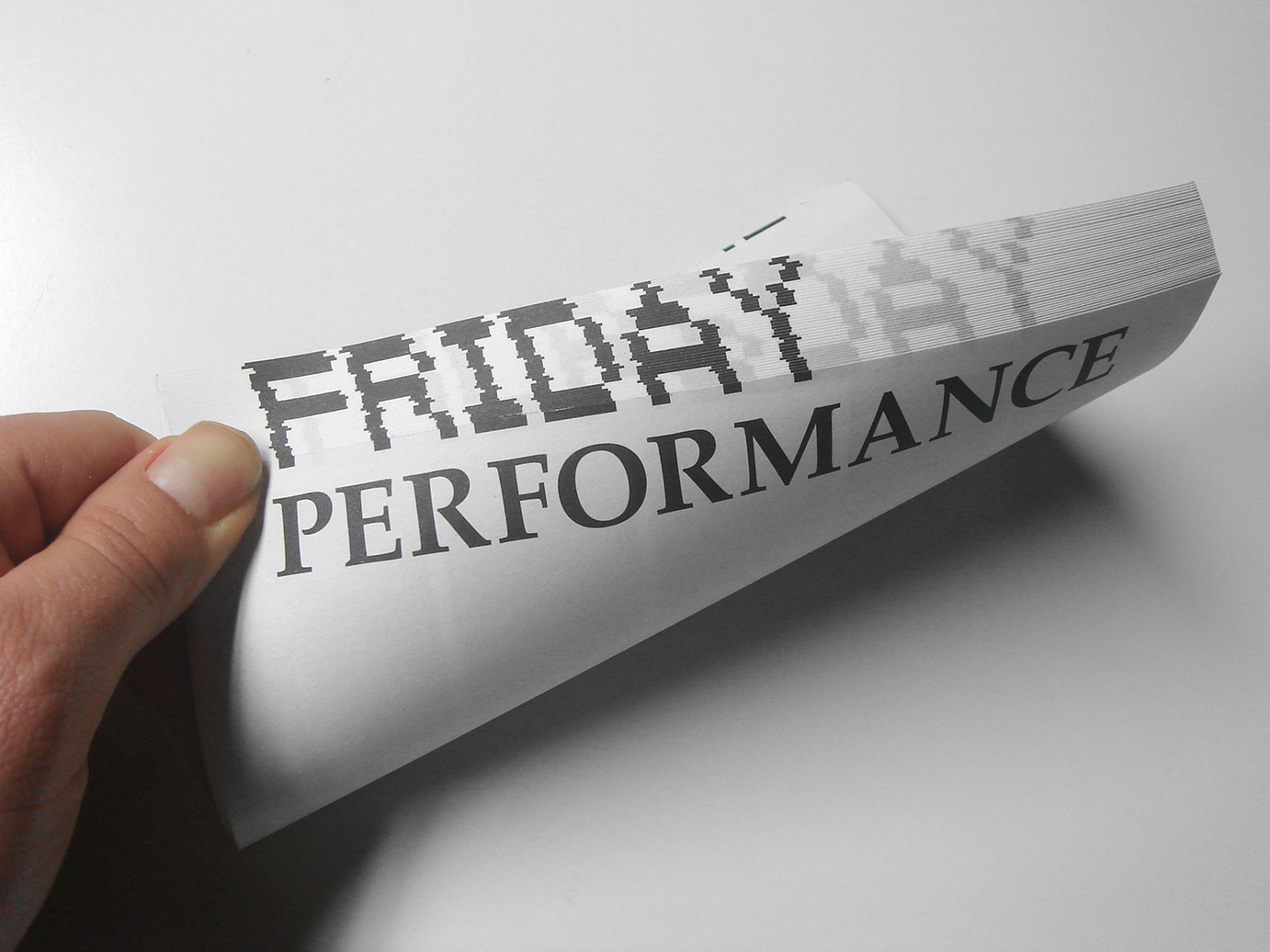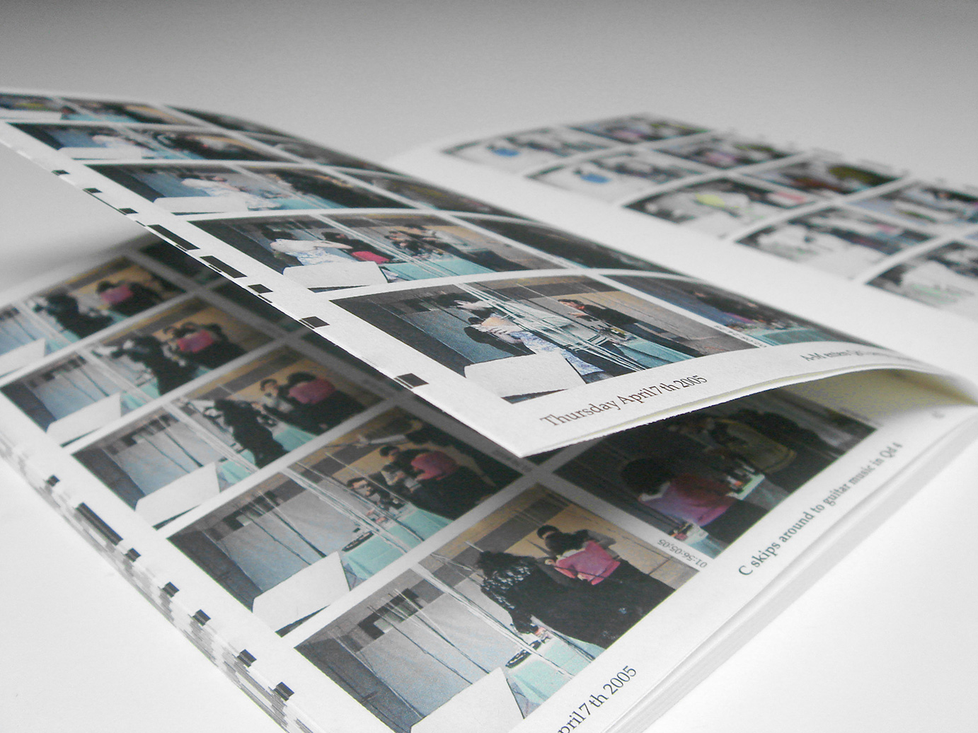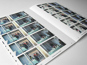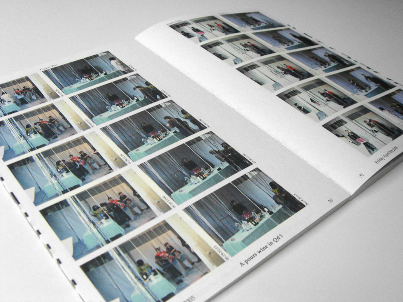 The publication Elapse I & II contains over 600 video stills from the performance: Thursday, shown on the left hand side facing Friday, shown on the right. Each double face spread selects 10 video stills from an interval of approximately 5 minutes of the event in order to distill a chronology of performance, documentation, and comparison.
