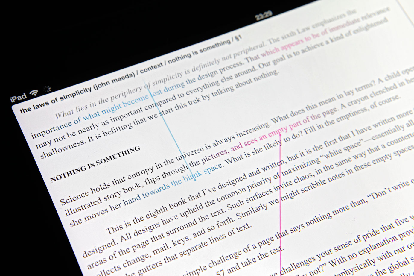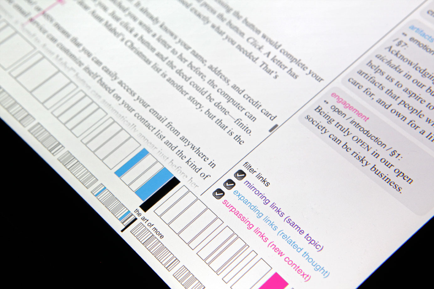 Every decision a reader makes when navigating through the non-linear book creates a personal, unique reading experience. The snippets and the genders of the hyperlinks, equip the reader with a compass to navigate the text and make conscious decisions to either continue the predetermined track of the author or deviate by enhancing or surpassing the current topic.