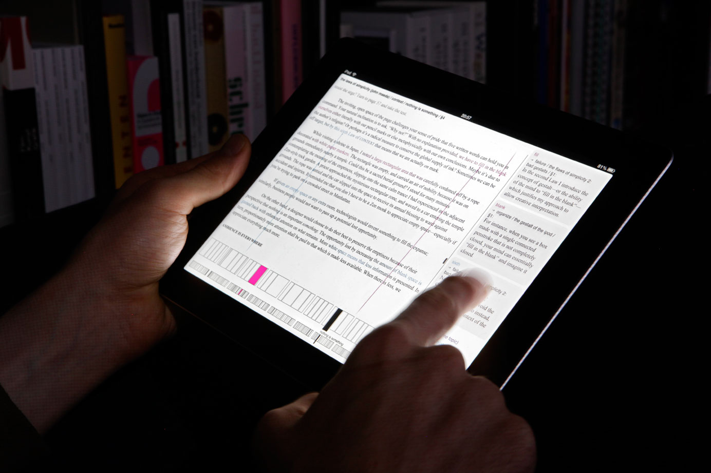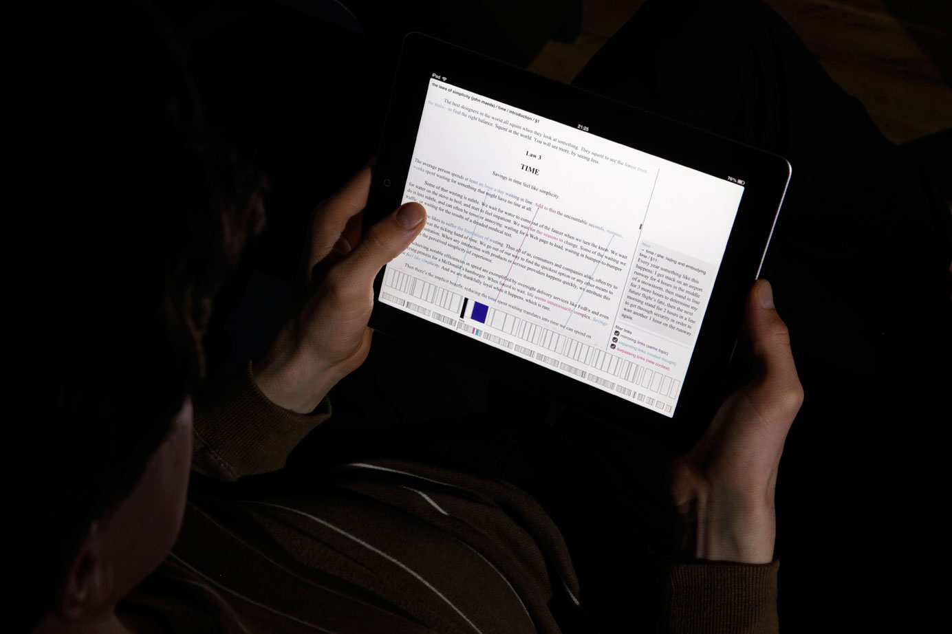 The screen is divided into three interactive areas: book content, paragraph navigation and snippets of hyperlinks.