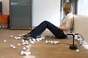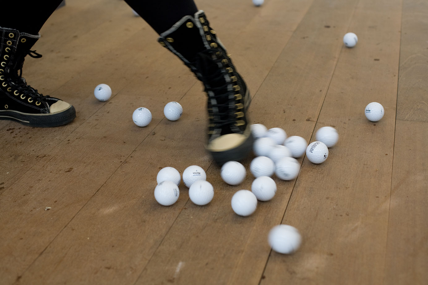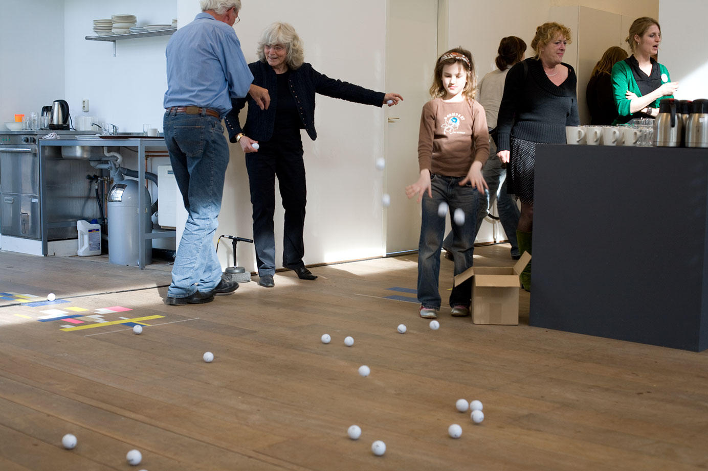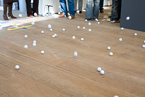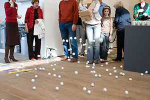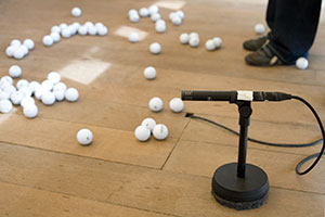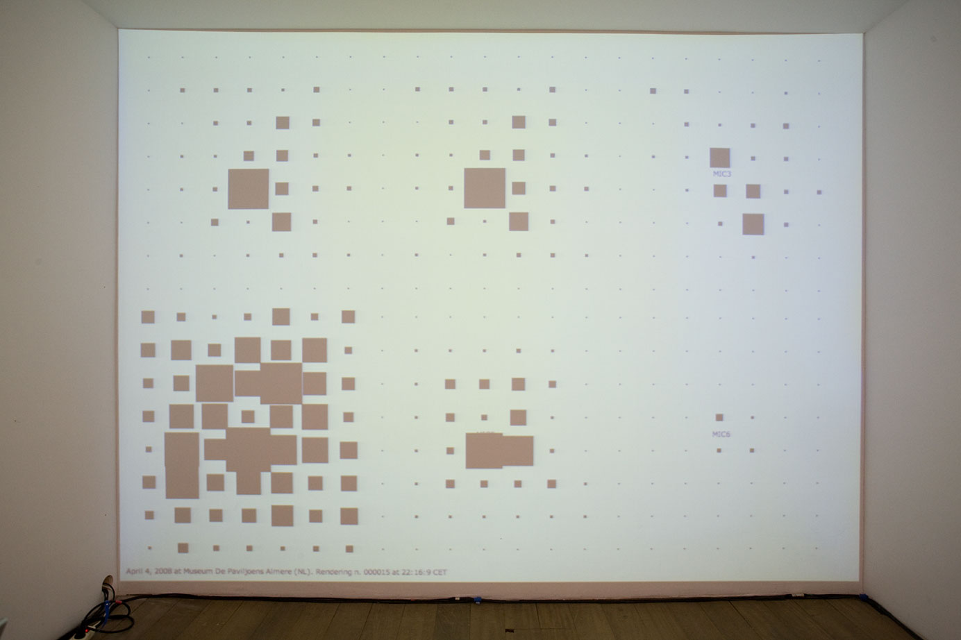 The audio-visual installation If Paintings Could Talk was developed for the 2008 museum weekend at Museum De Paviljoens to explore its very own acoustic patterns. For this the floor of the museum was covered with golf balls. Then, with every step a museum visitor incited the balls to scatter around and generate sound. This allowed to record the spatial dimensions with the help of microphones and subsequently process them into a visual image.