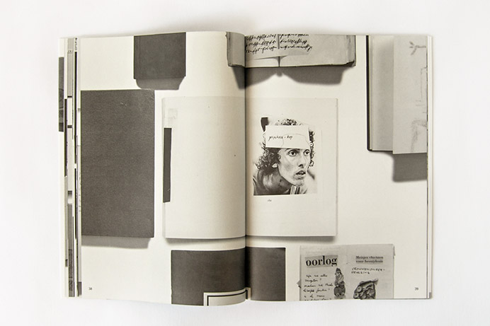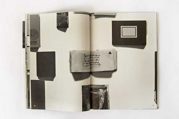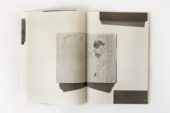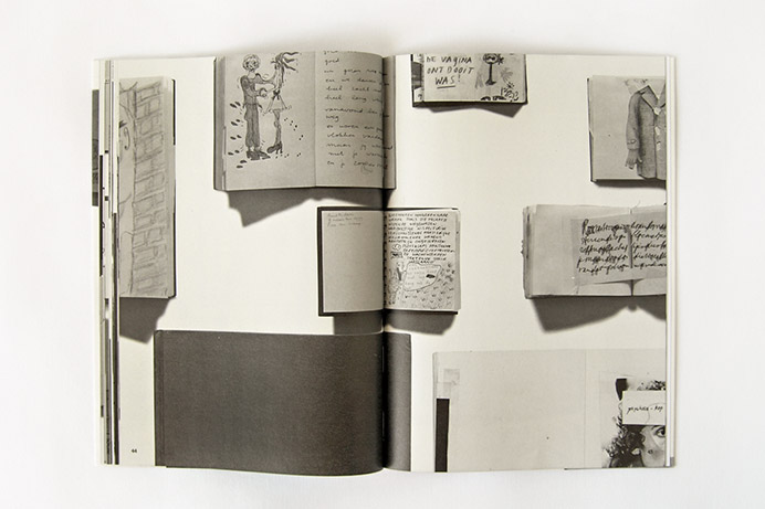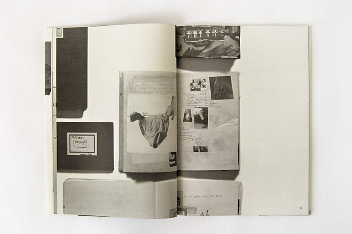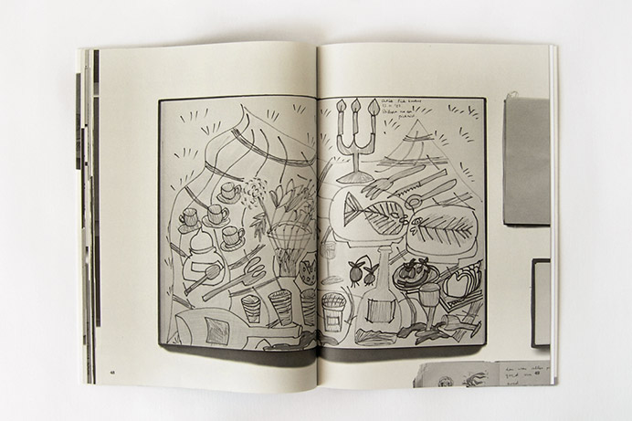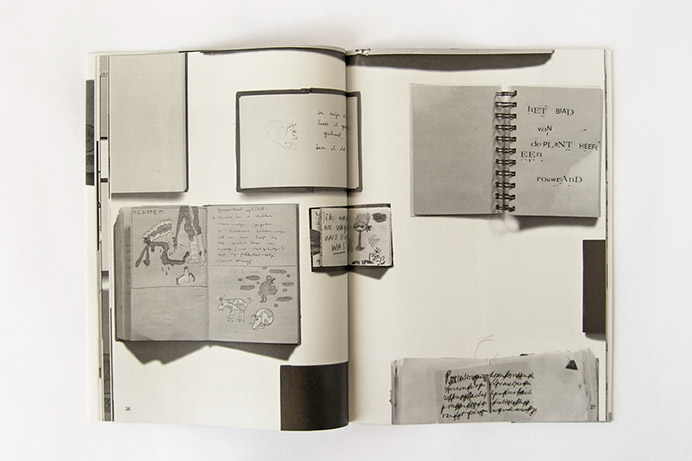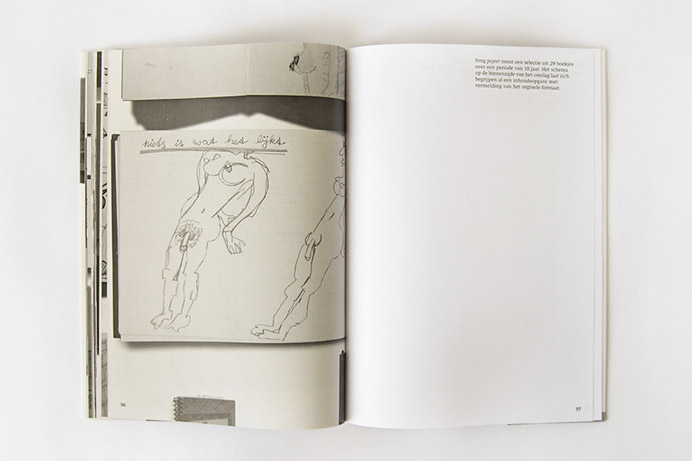 The design of the book contains a centered item on each open-faced double page, and neighbouring journals on the periphery. This allows the reader to make new connections and cross-references between the artist’s different pieces as he navigates through the bookscape. Intimate Paper begins with all the journals closed and further reveals their content. It is a process that leads the reader step by step to the artist’s immediate environment.