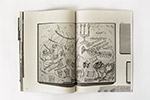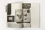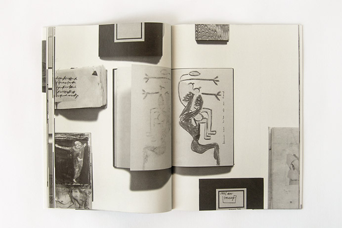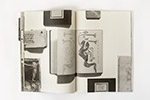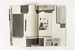 The interior of the dust jacket functions as a schematic table of contents. It is an overview of the artist’s journals, spread out over a surface. Black frames have been drawn over their outlines to indicate the overlapping sections of journals that are shown within the publication. The page numbers indicated at the bottom of each frame index the book to a corresponding spread on the inside.