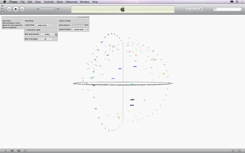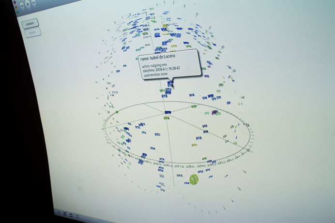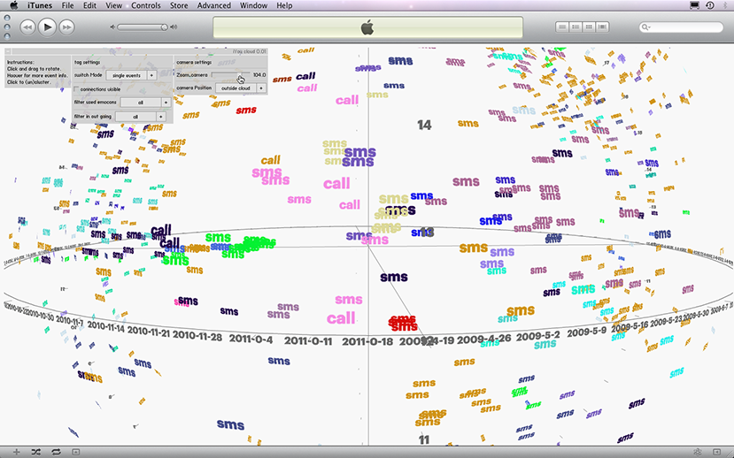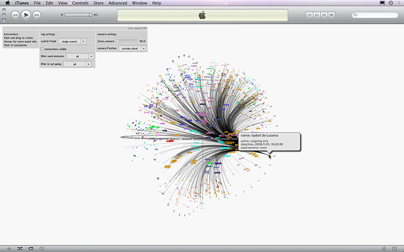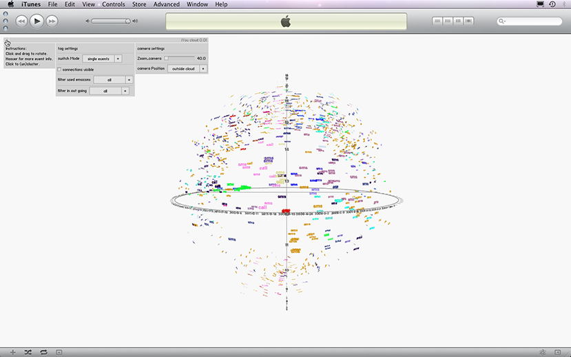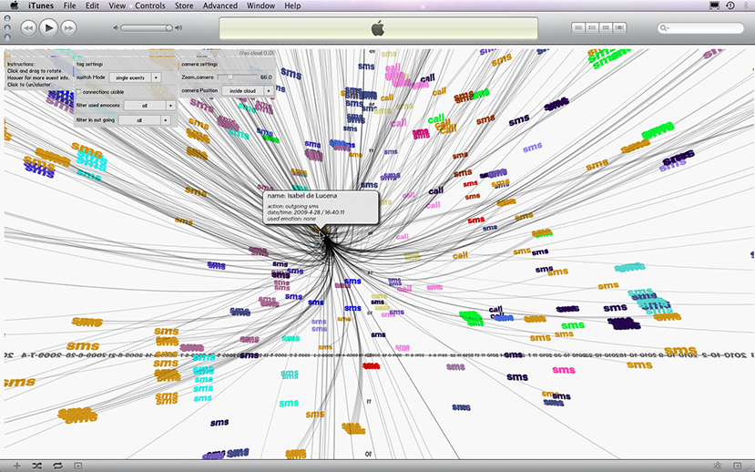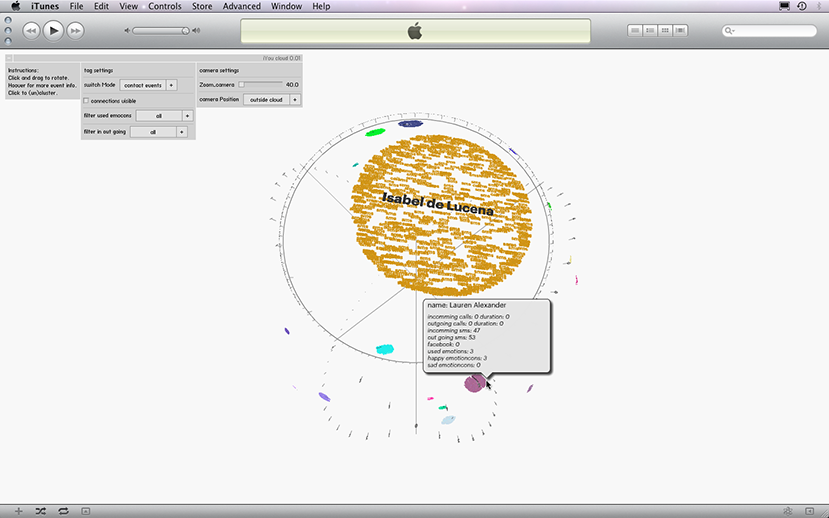 So far, the iYou™ consisted of the research into the quantity and nature of data sets and explored different visualizations and interface proposals. It resulted in a plug-in for iTunes that scans the iPhone’s back-up and presents the relationships between individual communication events in an interactive 3D globe.