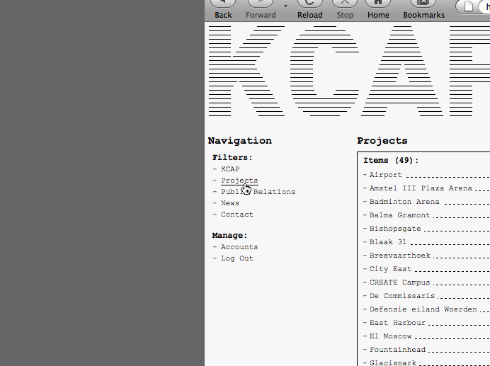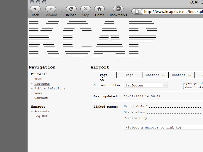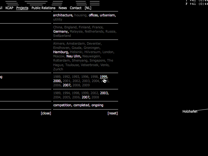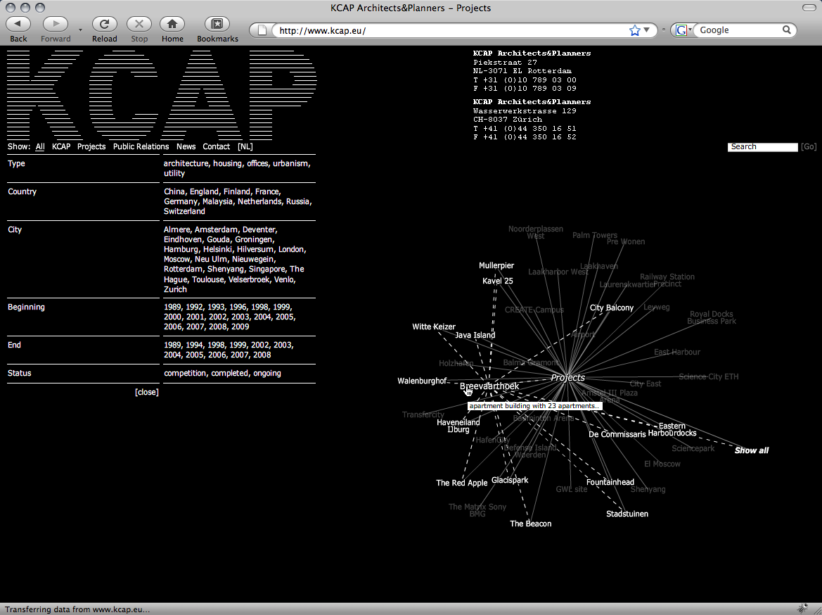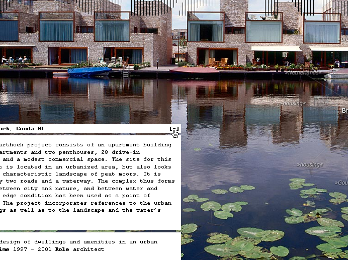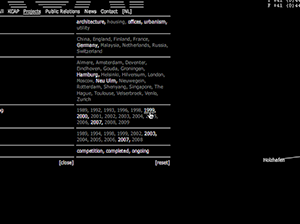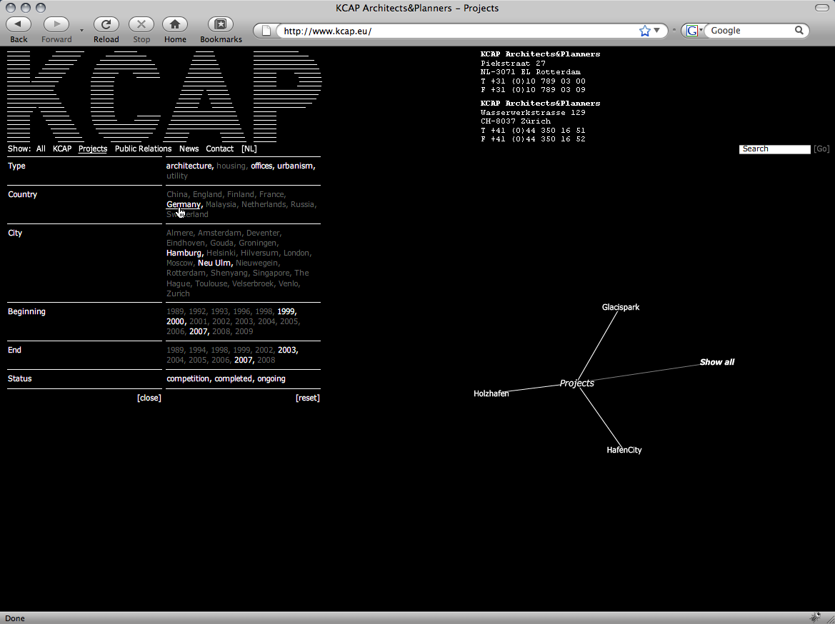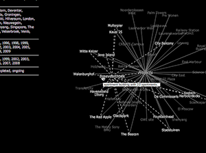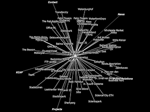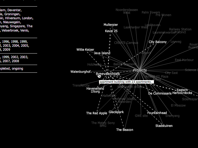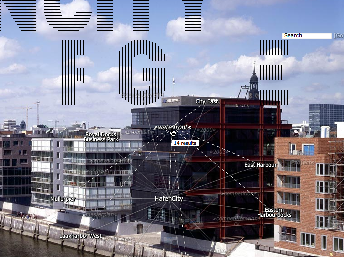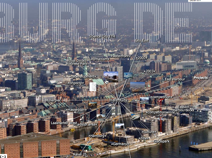 A single catalogue entry is assigned selected data and gathers information on a specific item affiliated to the subject both formally and semantically. This information possibly relates to other keywords listed in the database providing hereby an internal network structure. For instance, a search query using the keyword city could not only evoke overlapping search results like e.g. urban planning or master plan, but also come up with immediate project links such as KCAP’s HafenCity or Science City.