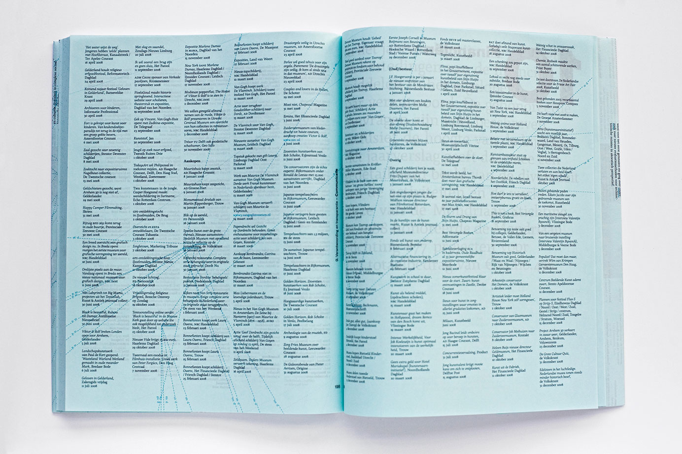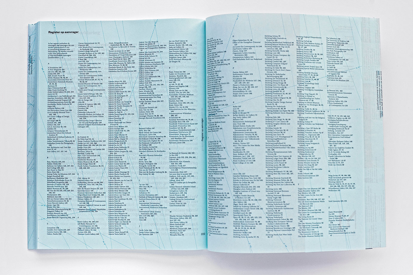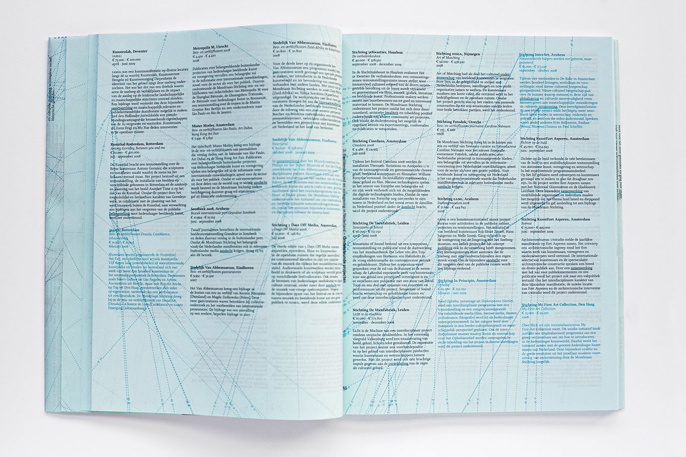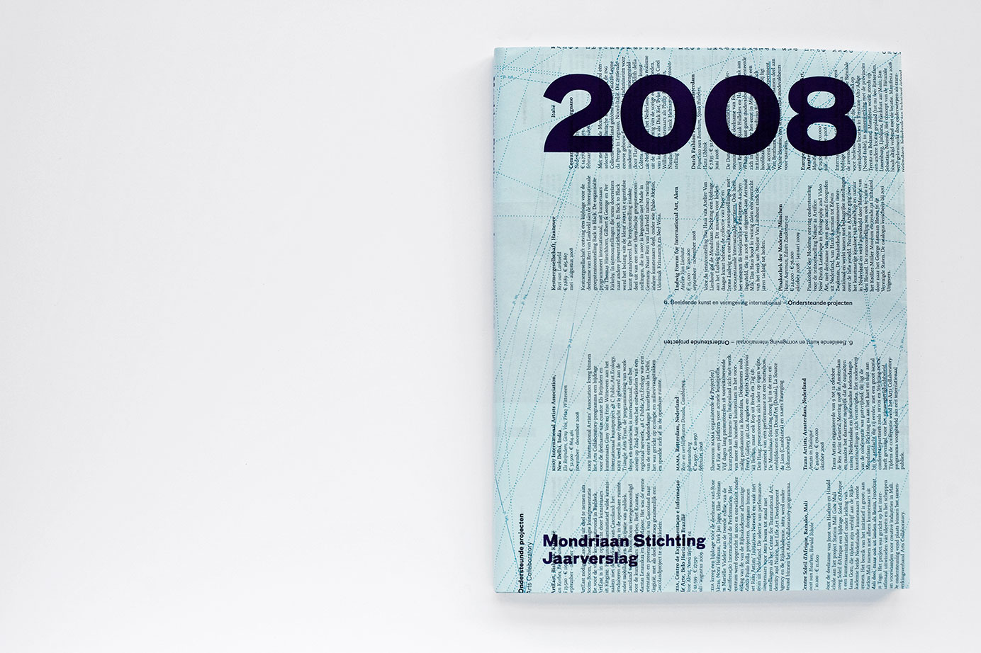 The Mondriaan Foundation maintains strong relationships with a large network of cultural institutions throughout the world in order to stimulate international cooperation and exchange in the field of contemporary art and design. This is why the 2008 annual report aims to reveal the content’s inherent bonds and connections and should be considered as a digital data cloud pressed into the physical embodiment of a book.