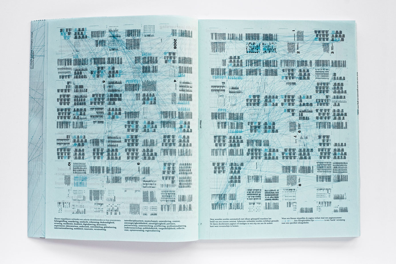 The publication consists of different types of hyperlinks that allow for contextual searching and browsing. While a dashed line connects related keywords like globalization, internationalization and mobility to a rhizomatic network, editorial links like cross references or footnotes result in a stellar line constellation that points to specific text passages within the book. If you follow the page numbers to the corresponding pages you may start reading the annual report non-chronologically and remove the narrative nature of text.