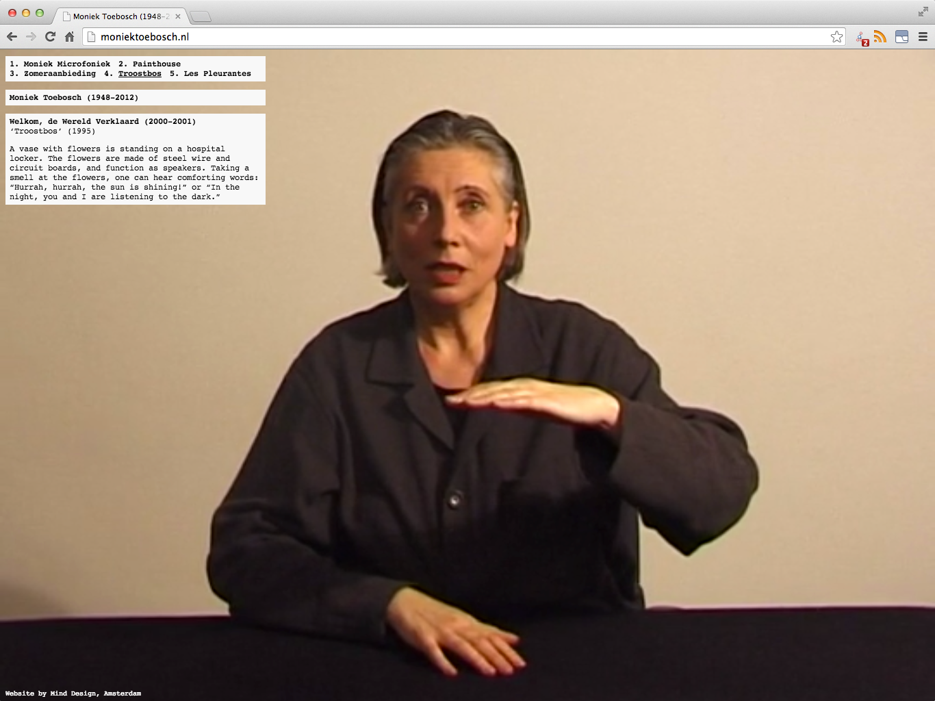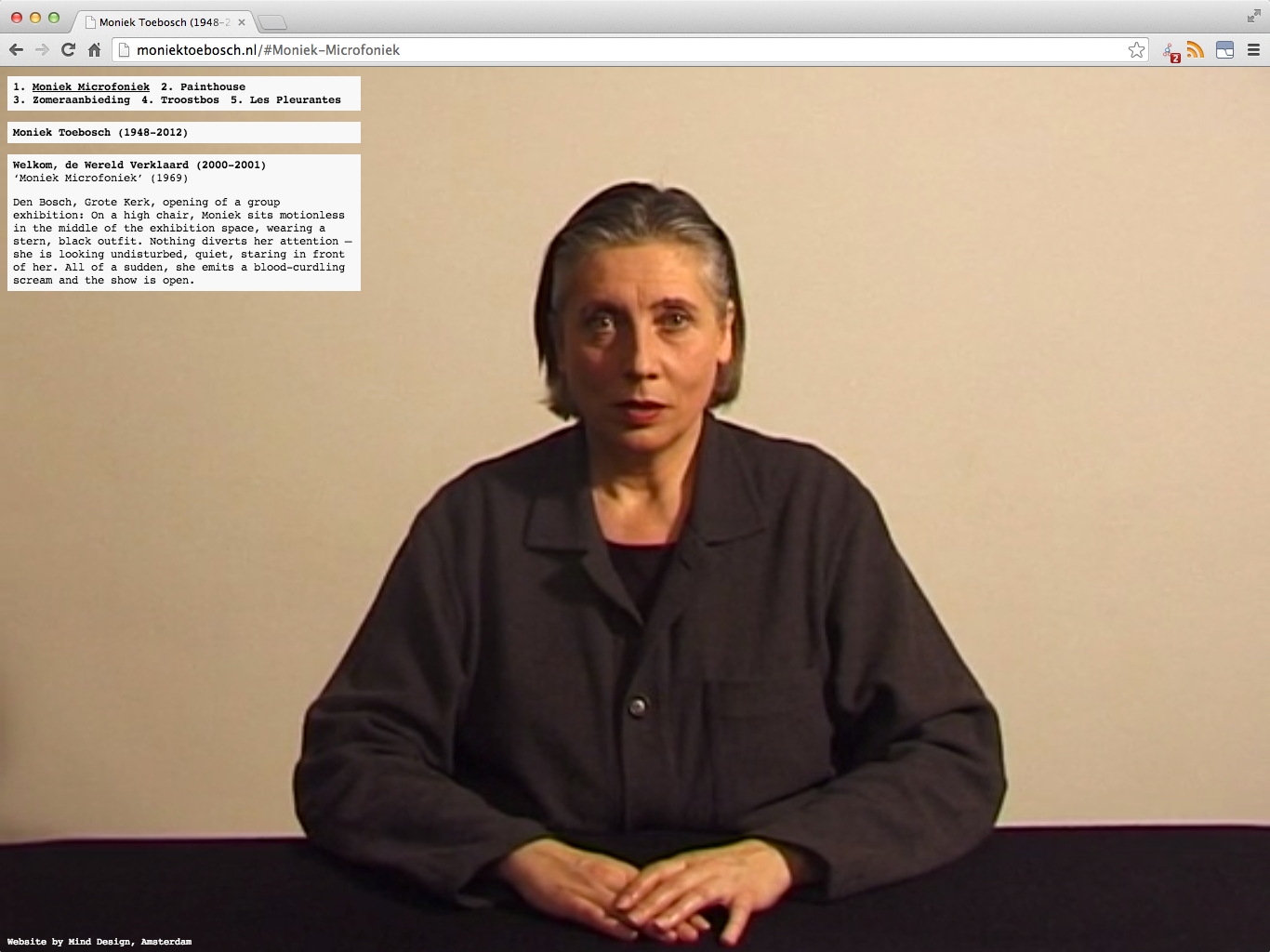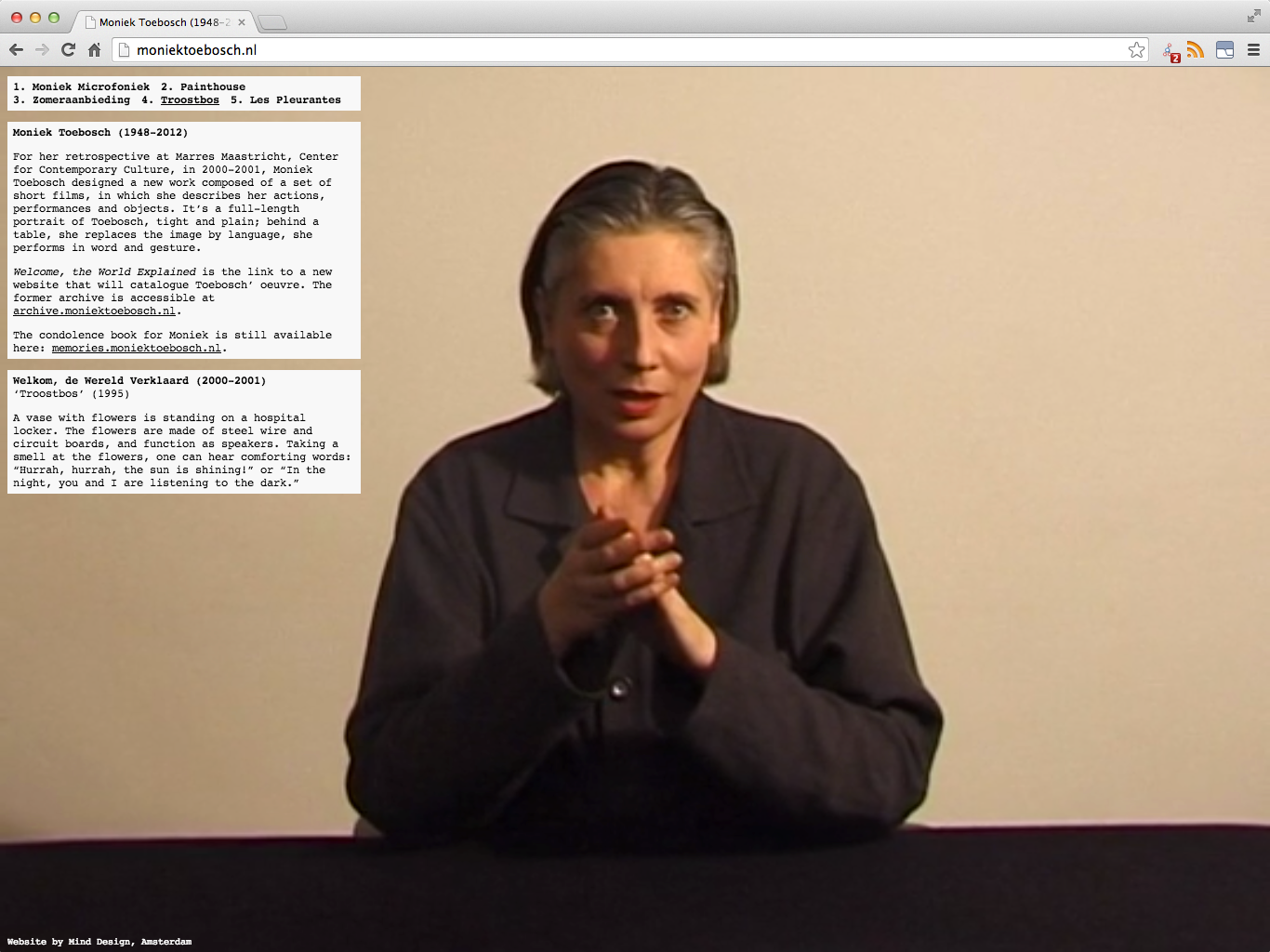 Moniek Toebosch’s website offers the visitor a preview of the oeuvre of the artist, who with her passing in 2012 left behind a rich legacy in the world of drama and theatre. The site shows a set of short films from the piece Welcome, the World Explained (2000–2001), which she developed for her retrospective exhibition at Marres – Center for Contemporary Culture, Maastricht.