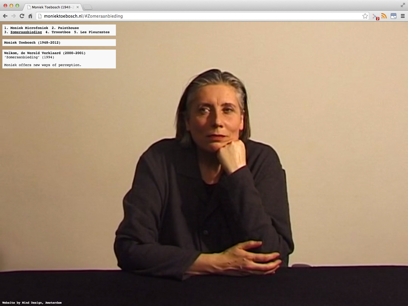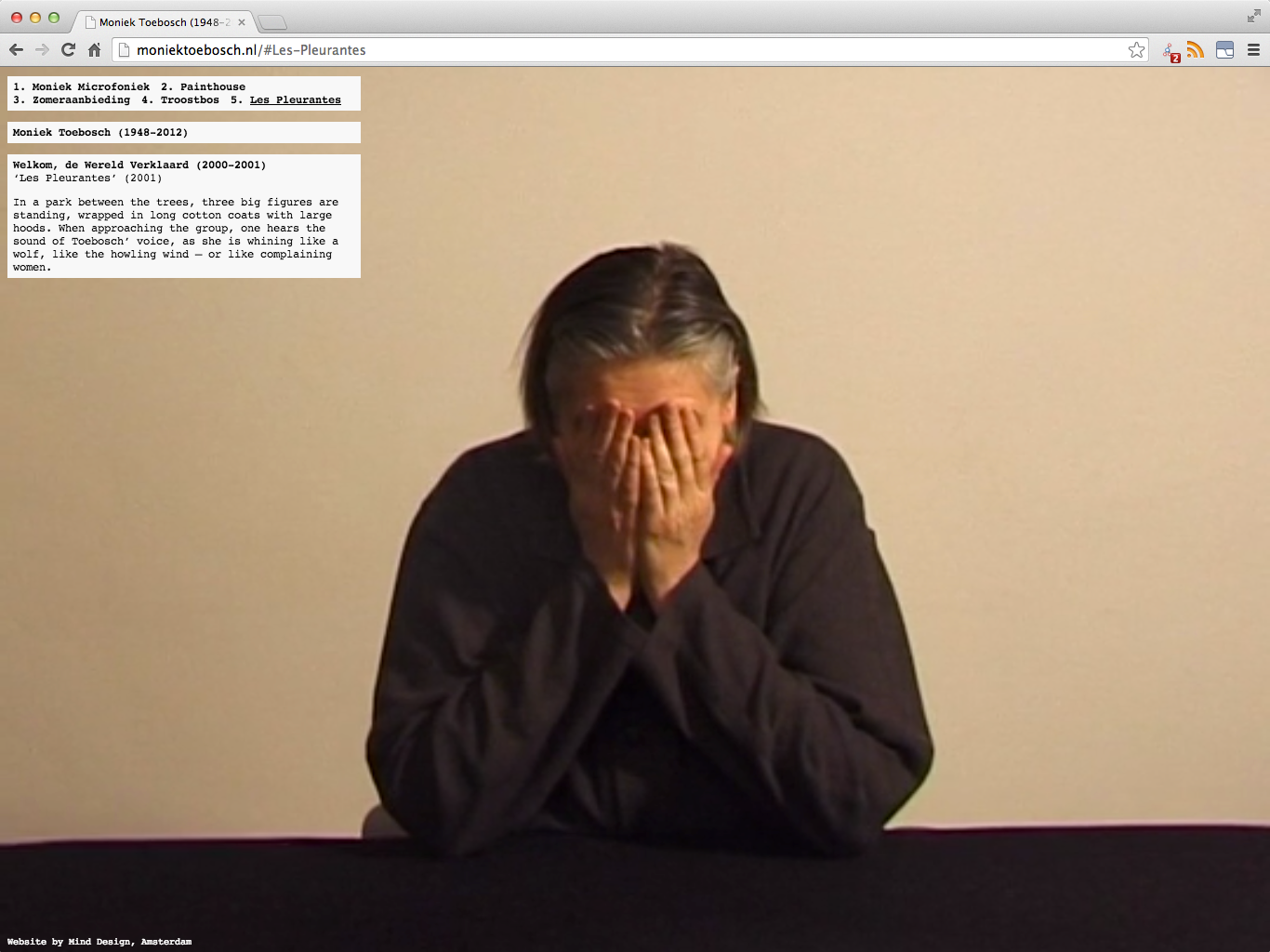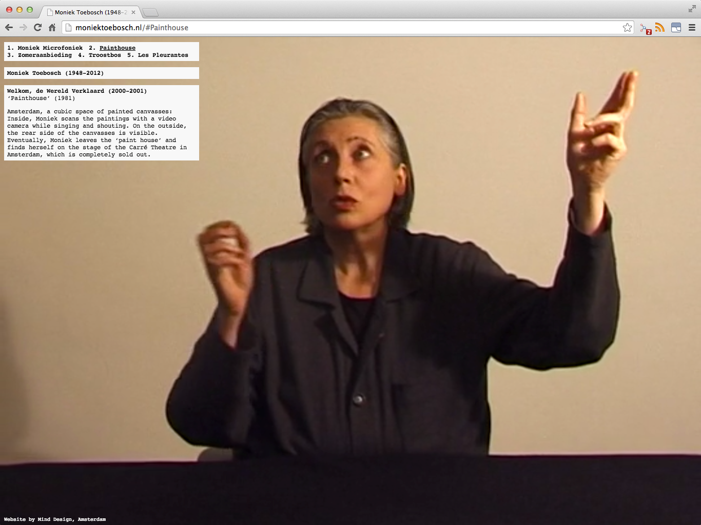 Moniek Toebosch’s website offers the visitor a preview of the oeuvre of the artist, who with her passing in 2012 left behind a rich legacy in the world of drama and theatre. The site shows a set of short films from the piece Welcome, the World Explained (2000–2001), which she developed for her retrospective exhibition at Marres – Center for Contemporary Culture, Maastricht.