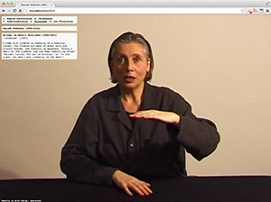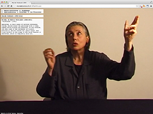 In these videos, Toebosch elaborates extensively on pieces of her own work and includes detailed descriptions of her intentions, actions and situations. This work became a full-length portrait of the artist, in which she sits behind a table, replaces the image by language, and performs in word and gesture.