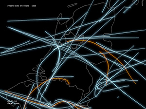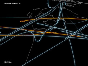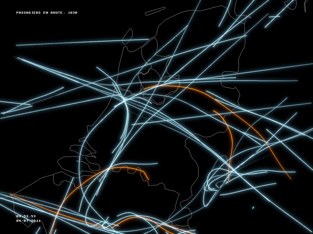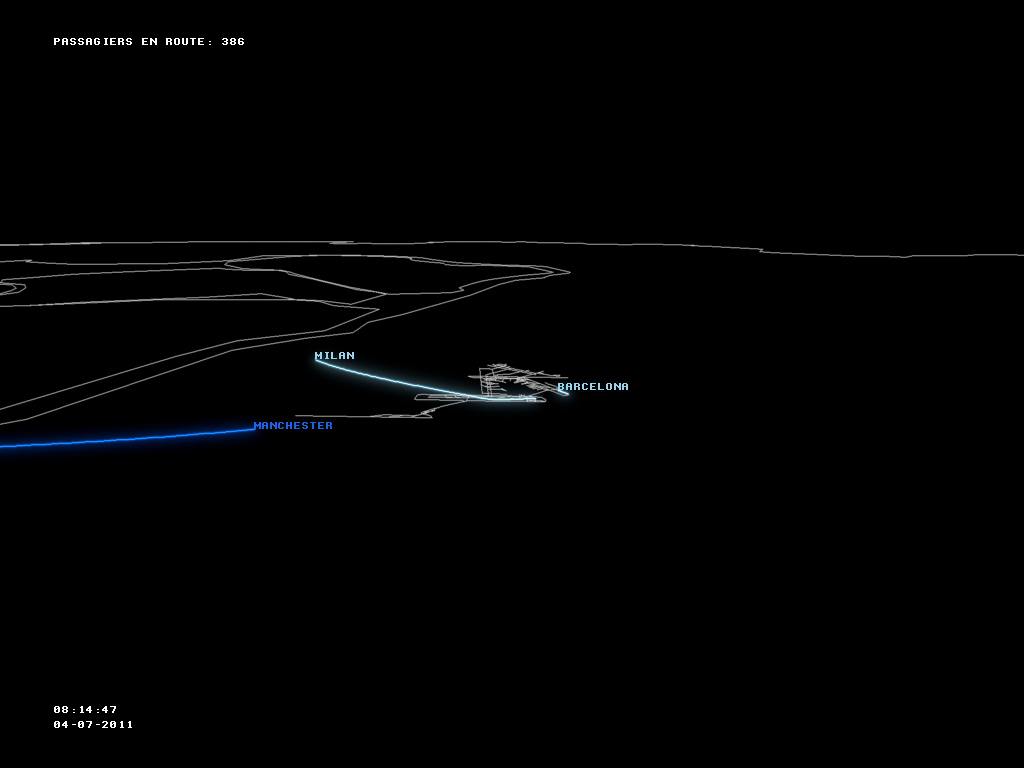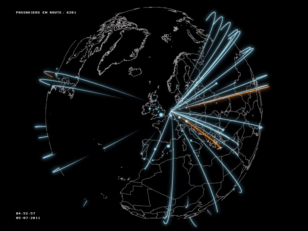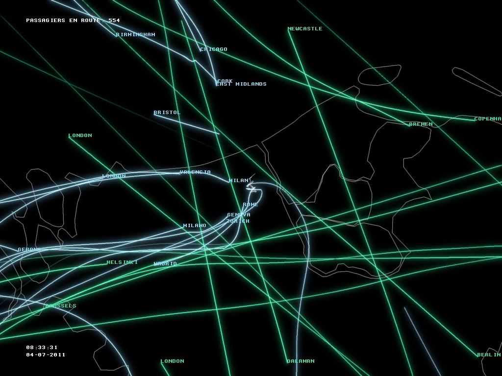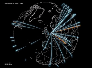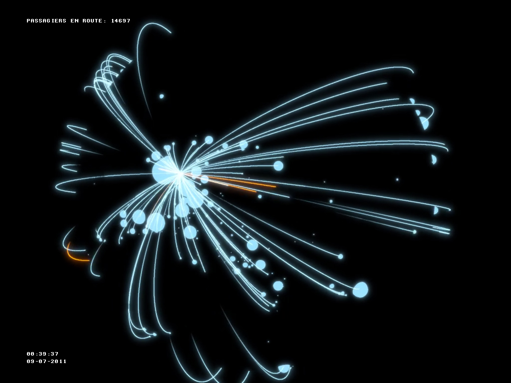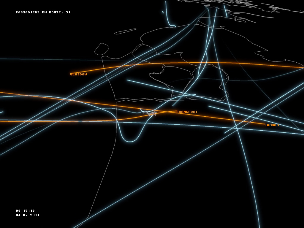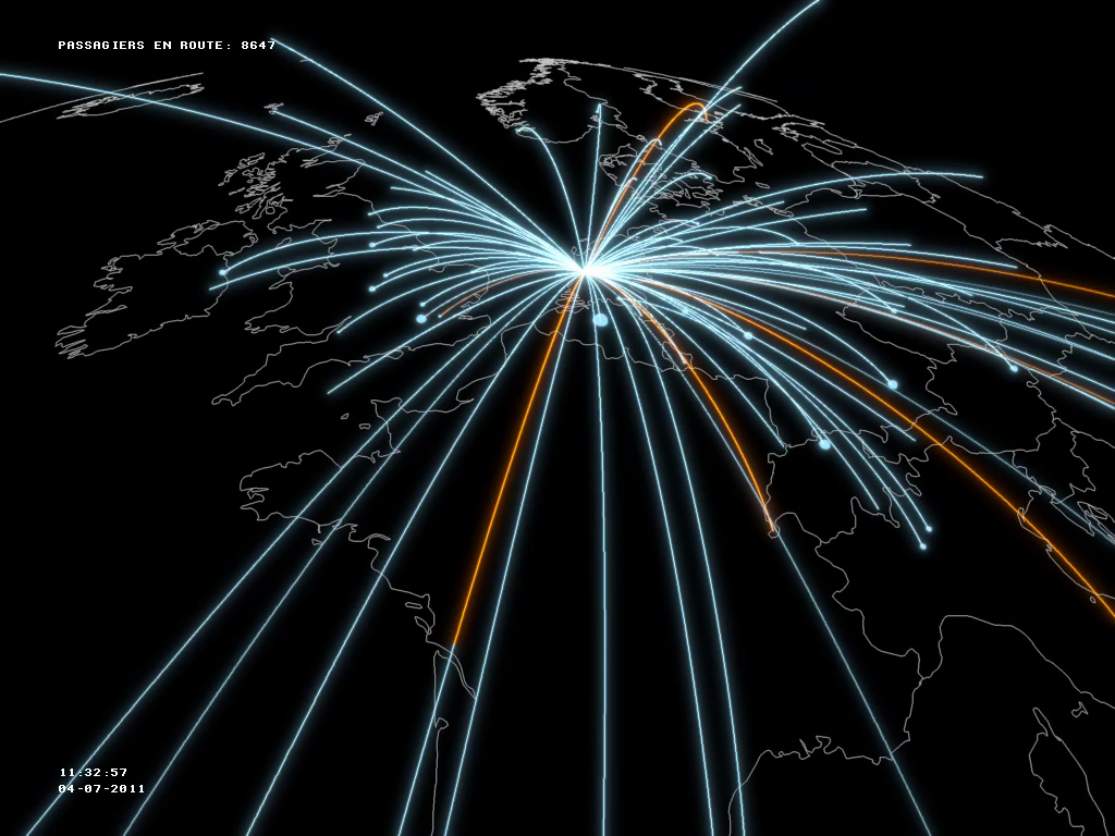 The movie visualizes a data set with the geo-locations of over 31,000 flights recorded in July 2011. It extracts relevant statistics from the given data and presents them in the form of a gradual zoom out, from Schiphol into the outer space.