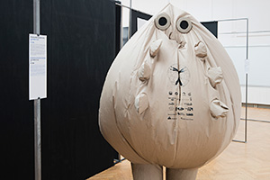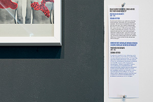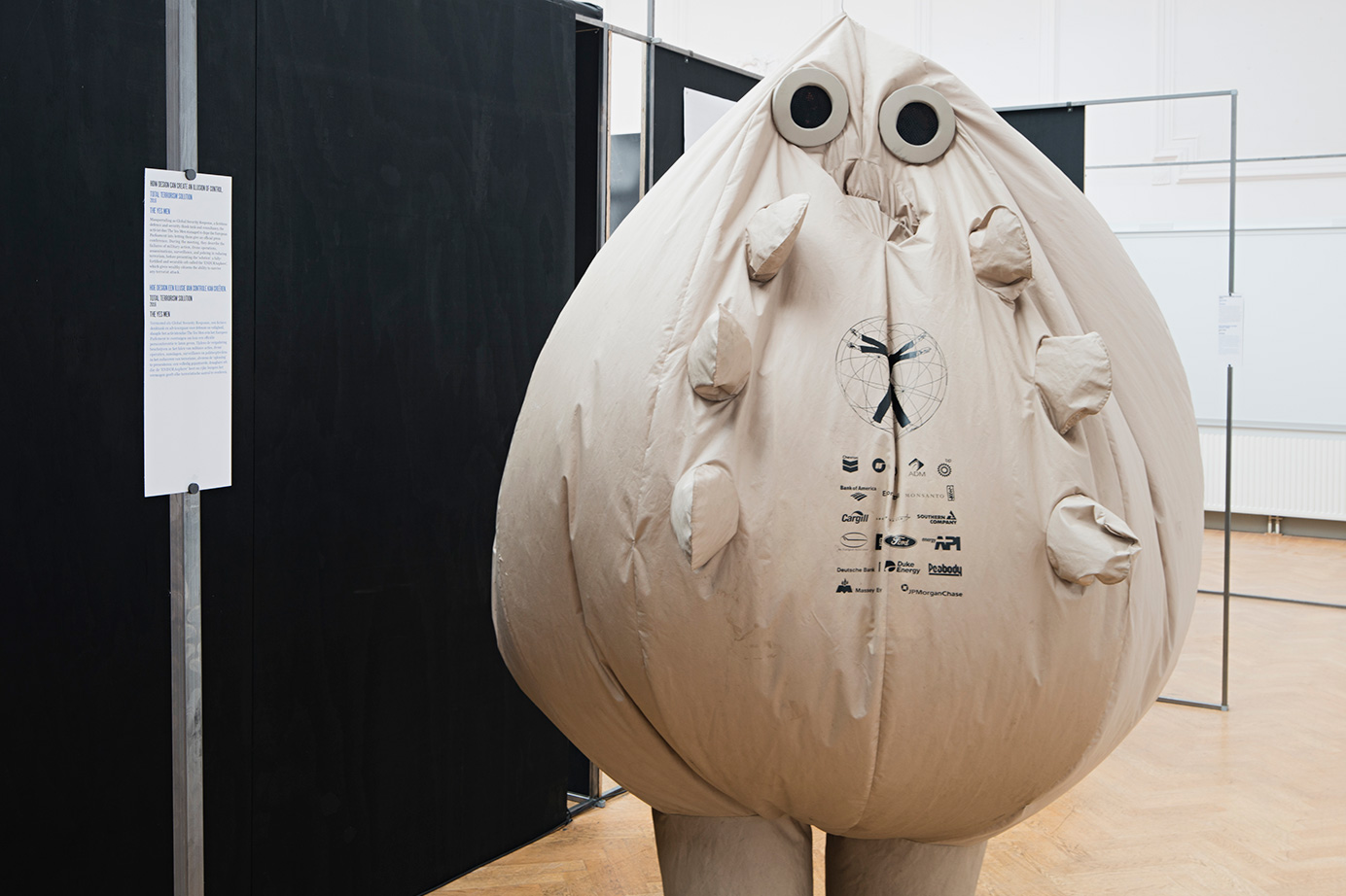 Props by activist duo The Yes Men next to a project description attached by magnets.