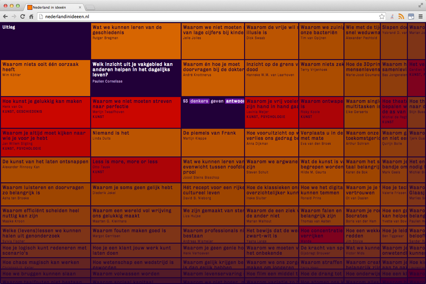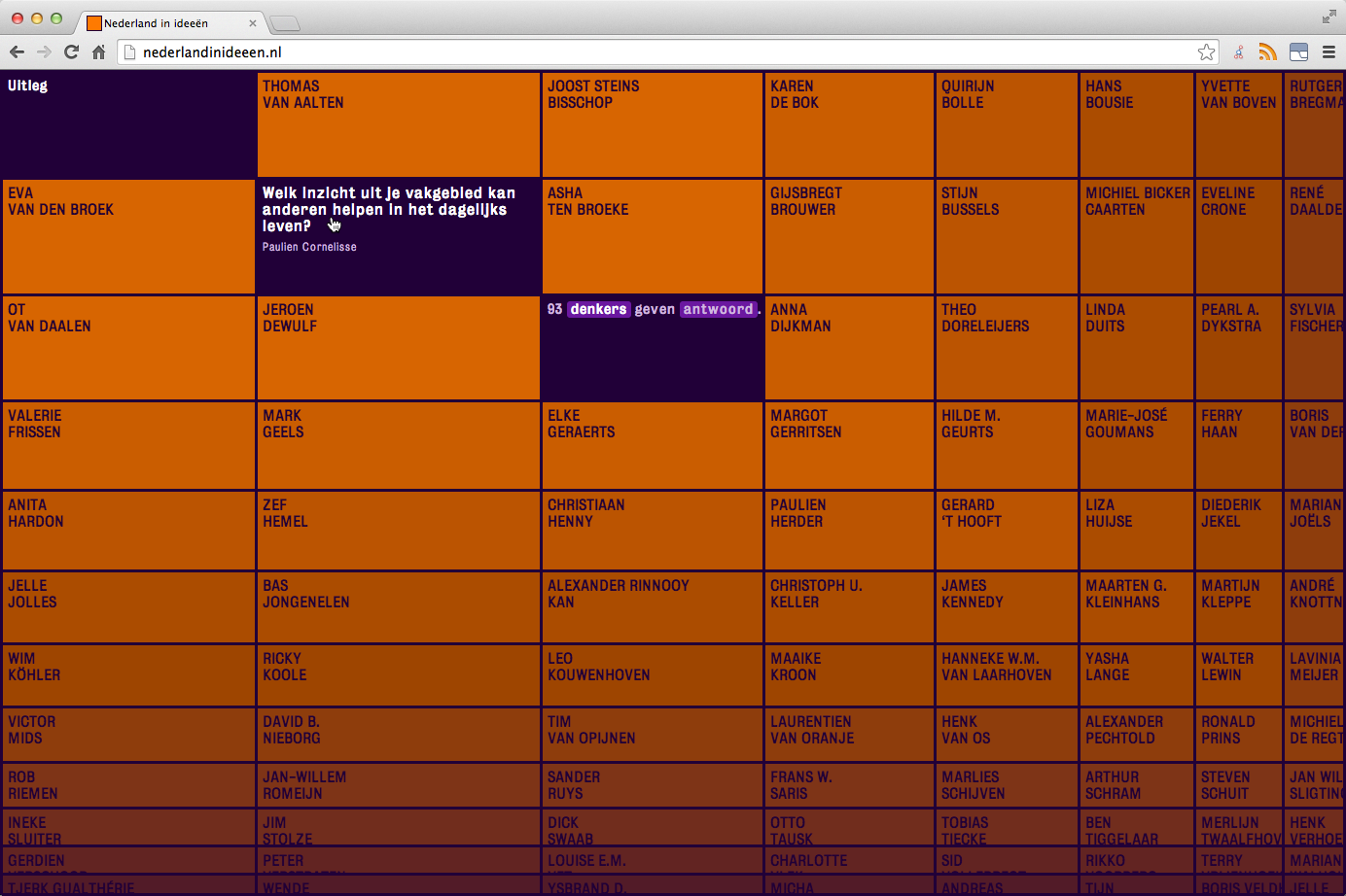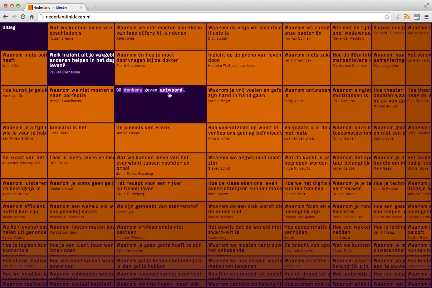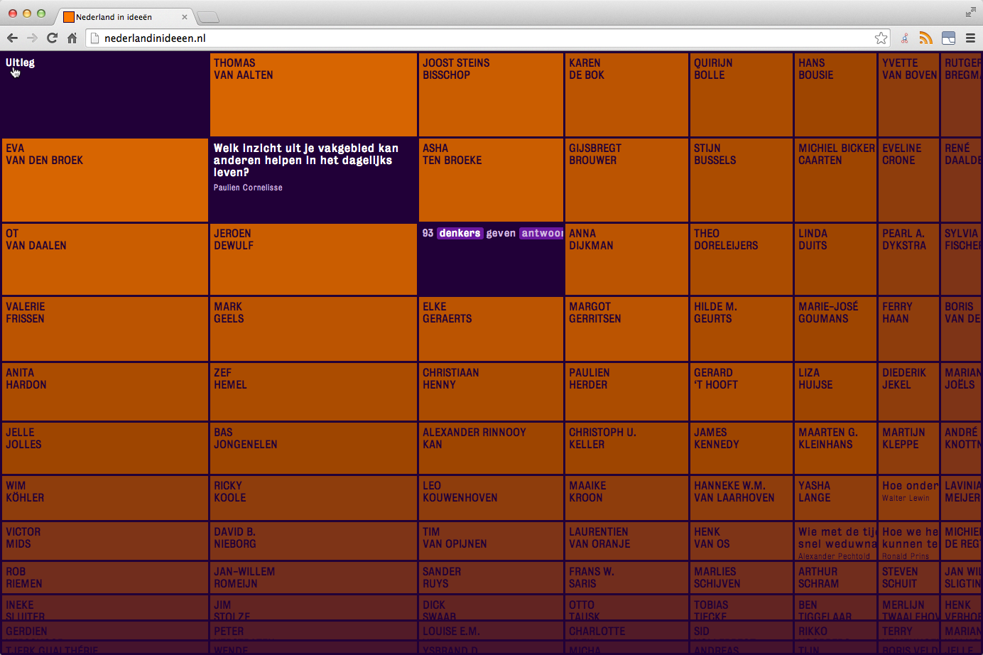 Nederland in ideeën is an online exhibition following the publication of the same name, in which 93 scientists, entrepreneurs and artists share their personal views on the challenges of daily life. Its front page functions like a gateway to the entire content widely scattered over the Internet. It glues together the contributions by pointing to articles published on the authors’ personal websites. www.nederlandinideeen.nl was presented during the book launch on November 17, 2014 at FOAM – Photography Museum Amsterdam.
