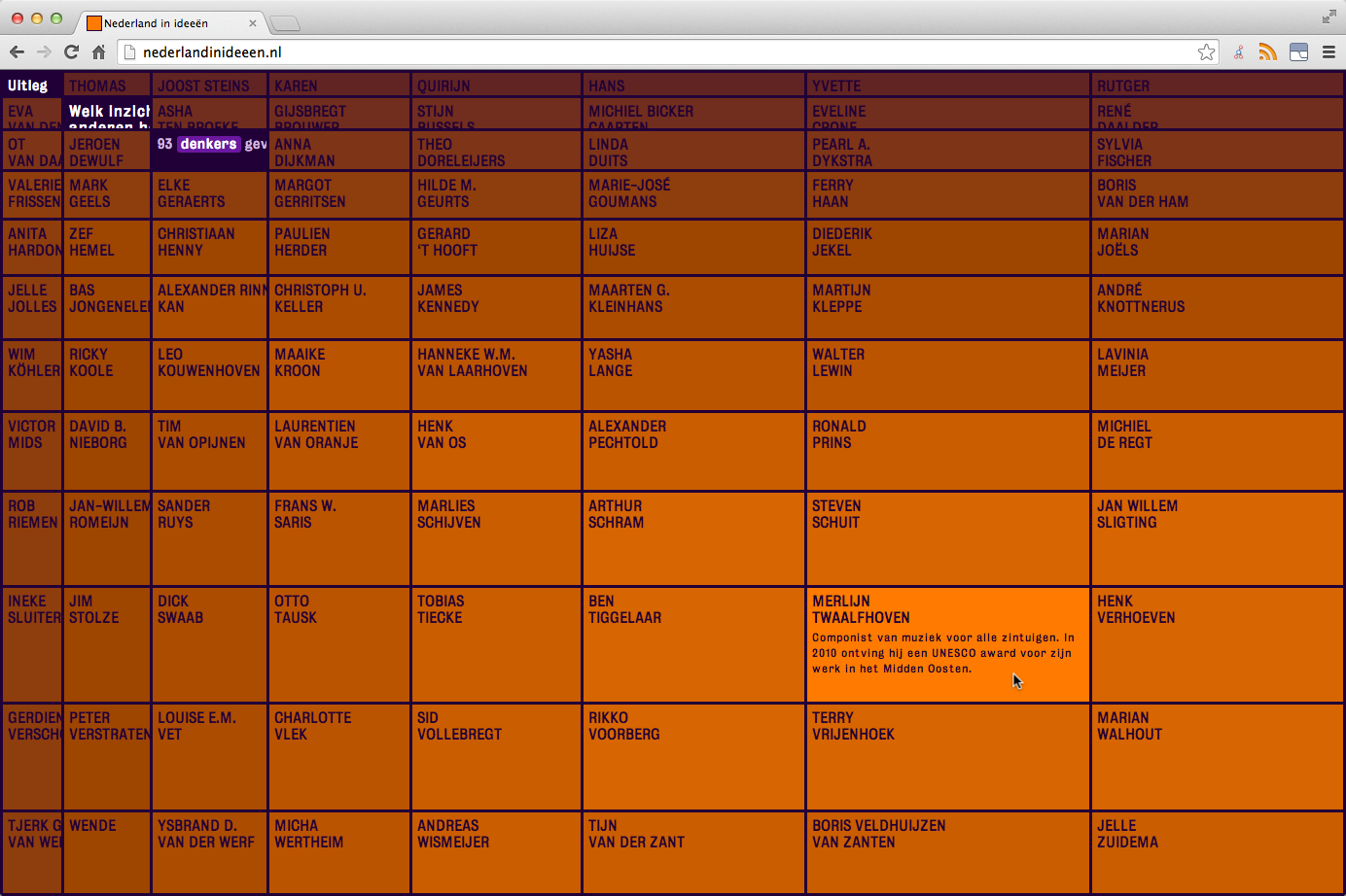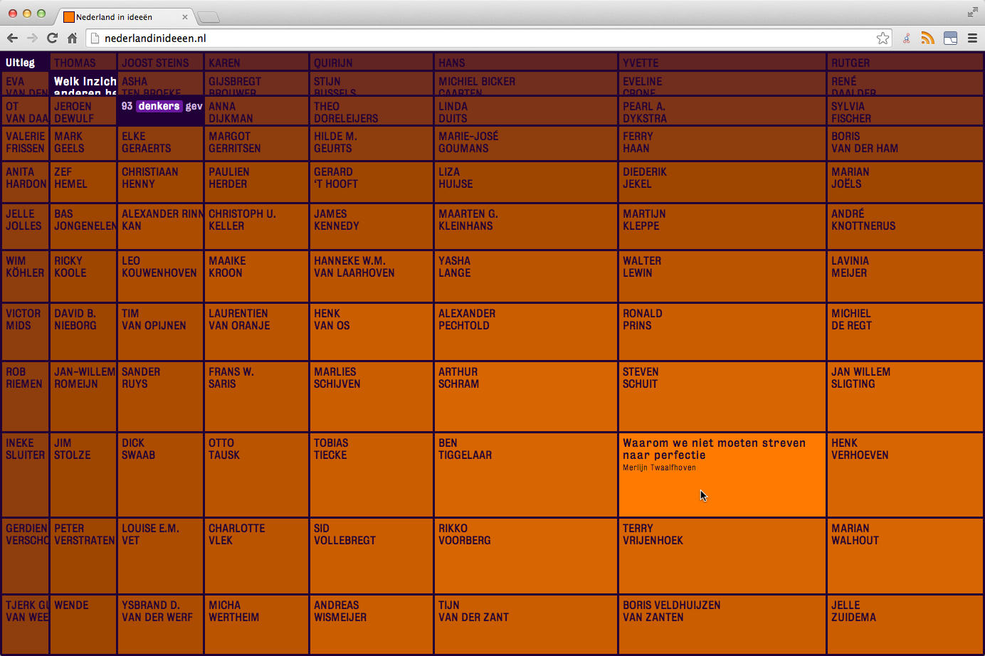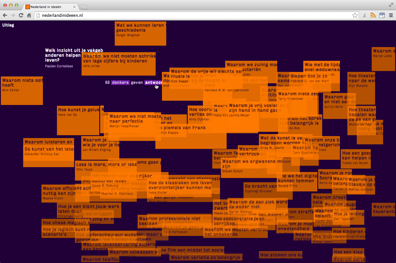 Nederland in ideeën is an online exhibition following the publication of the same name, in which 93 scientists, entrepreneurs and artists share their personal views on the challenges of daily life. Its front page functions like a gateway to the entire content widely scattered over the Internet. It glues together the contributions by pointing to articles published on the authors’ personal websites. www.nederlandinideeen.nl was presented during the book launch on November 17, 2014 at FOAM – Photography Museum Amsterdam.