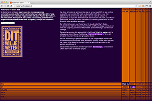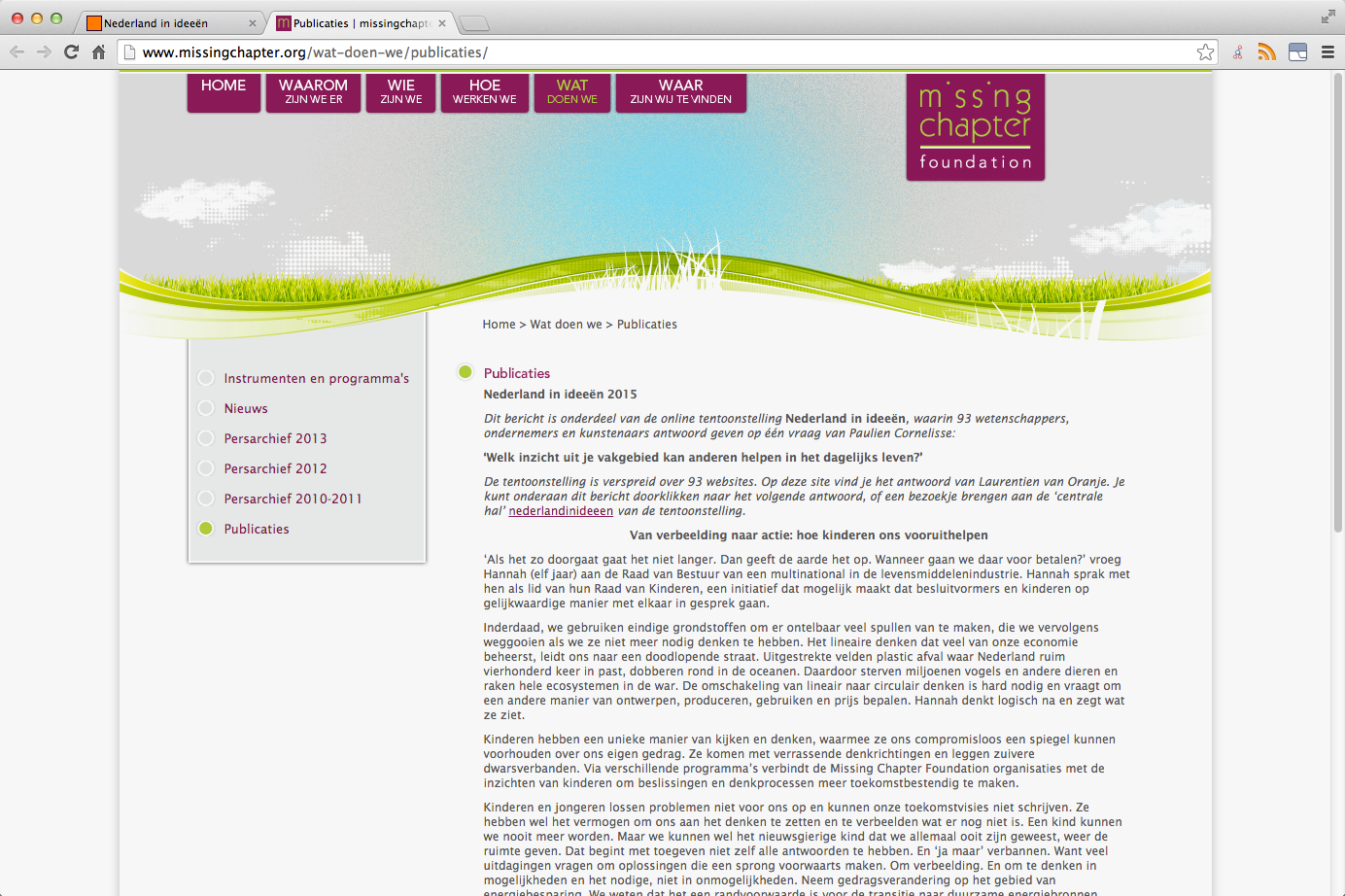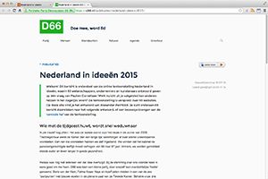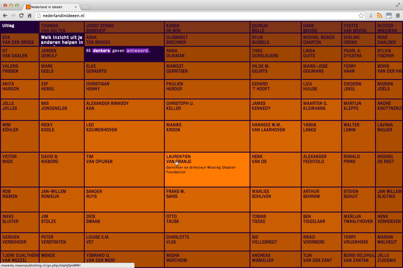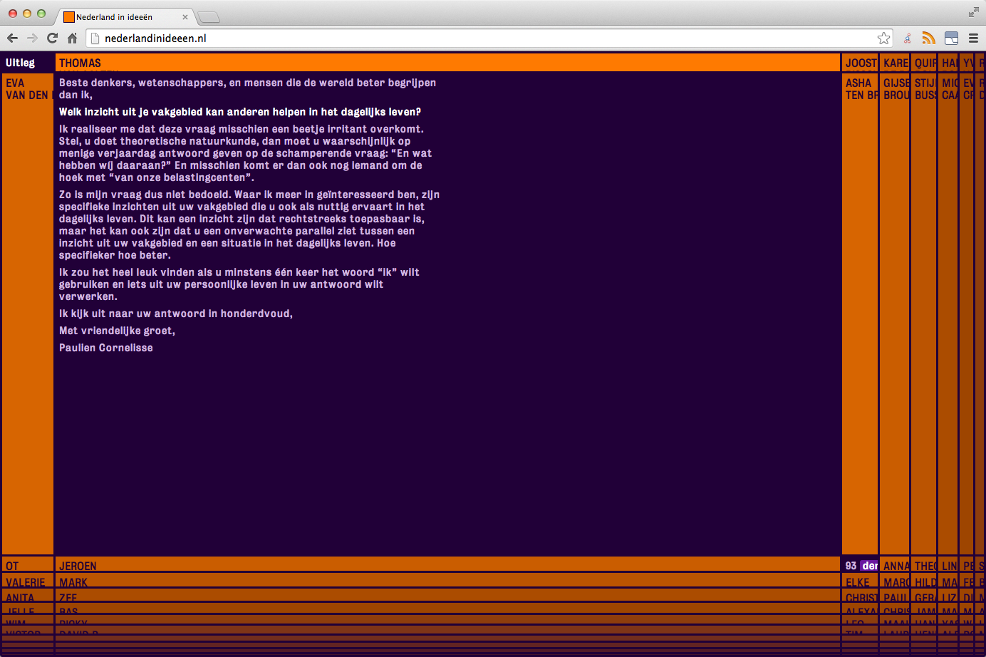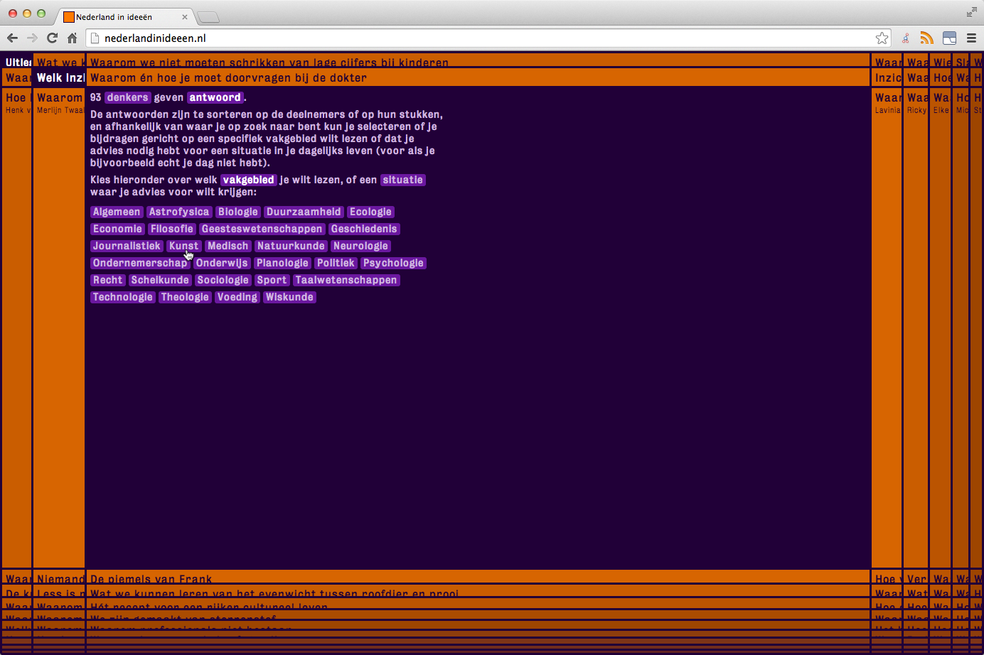 Nederland in ideeën is an online exhibition following the publication of the same name, in which 93 scientists, entrepreneurs and artists share their personal views on the challenges of daily life. Its front page functions like a gateway to the entire content widely scattered over the Internet. It glues together the contributions by pointing to articles published on the authors’ personal websites. www.nederlandinideeen.nl was presented during the book launch on November 17, 2014 at FOAM – Photography Museum Amsterdam.