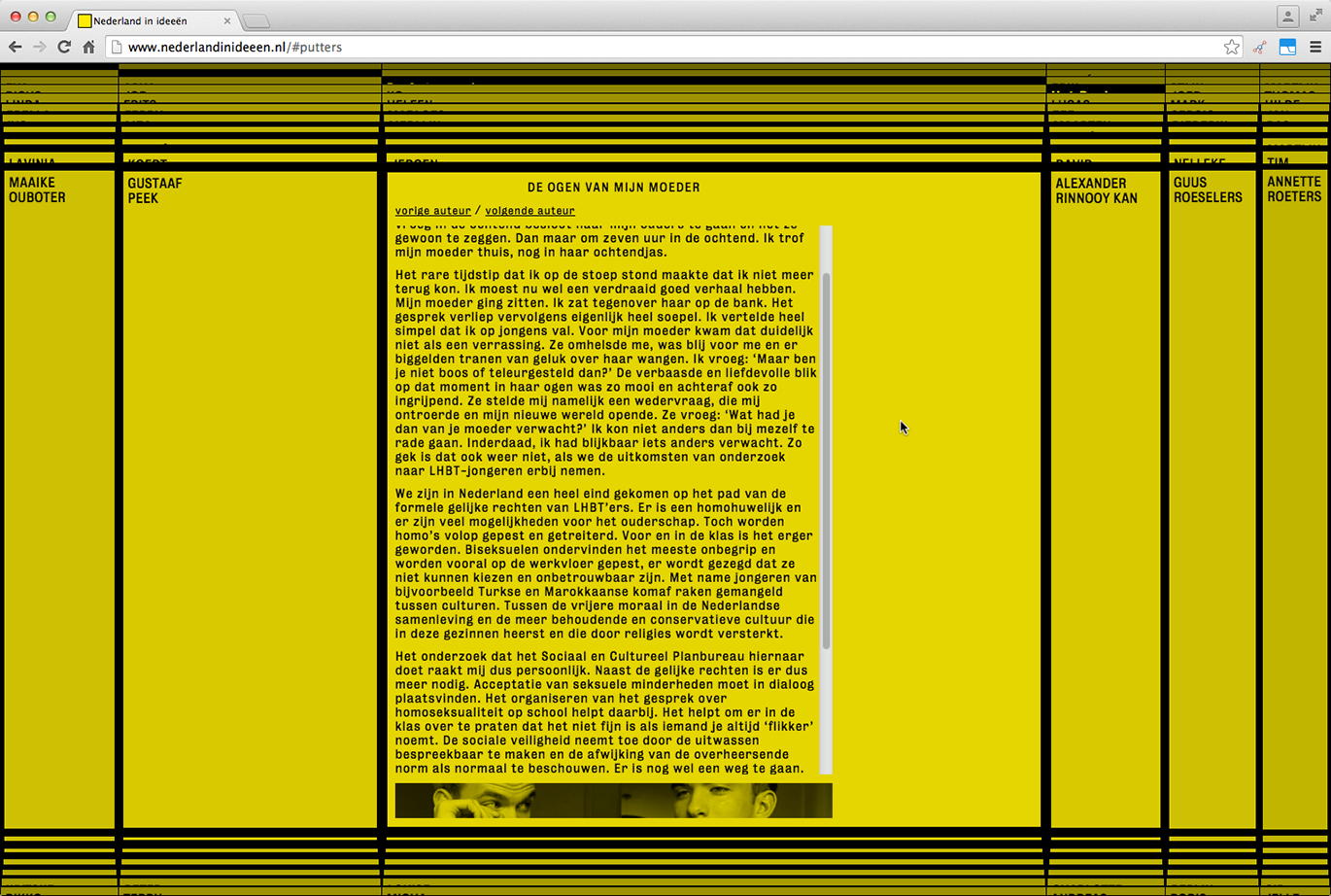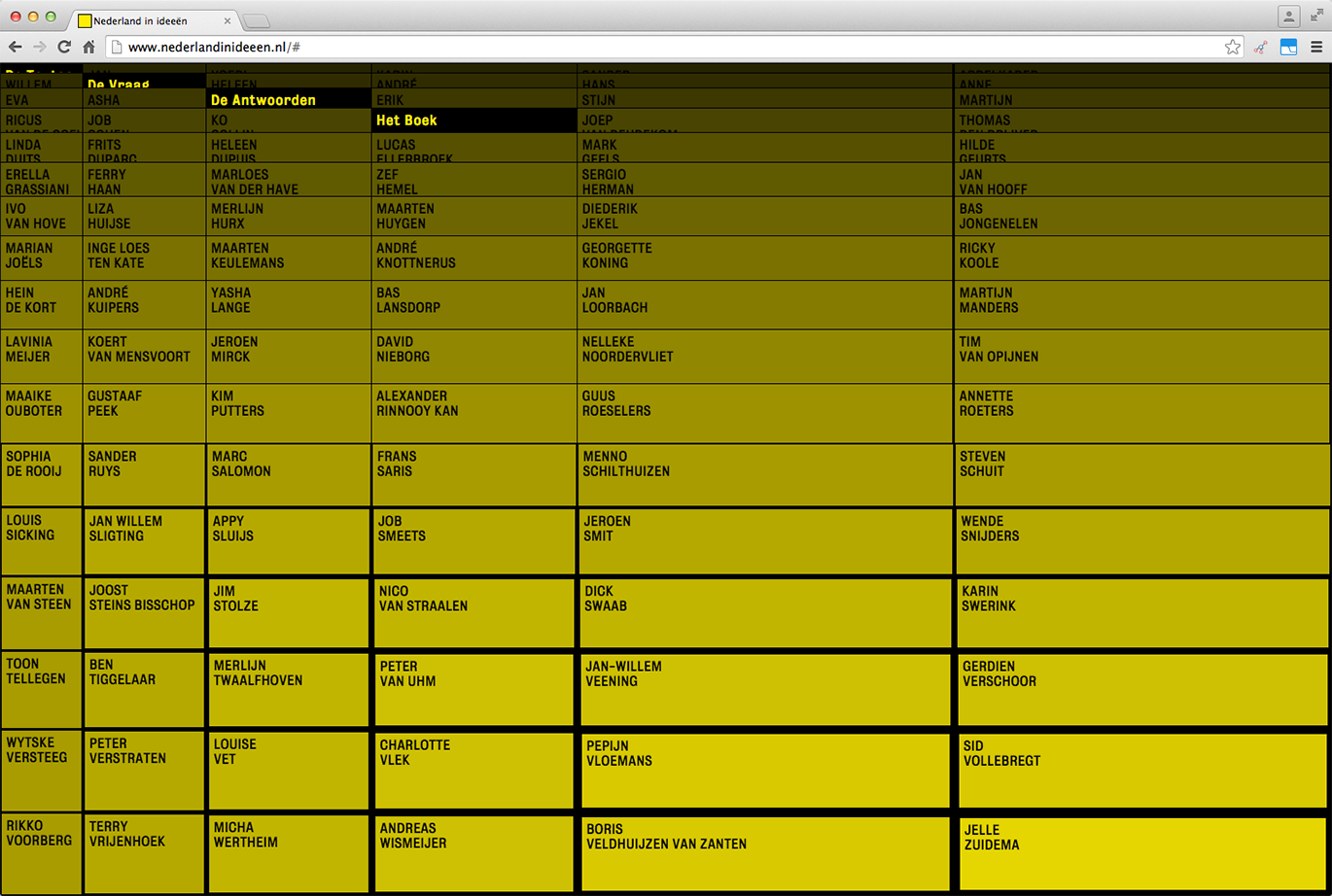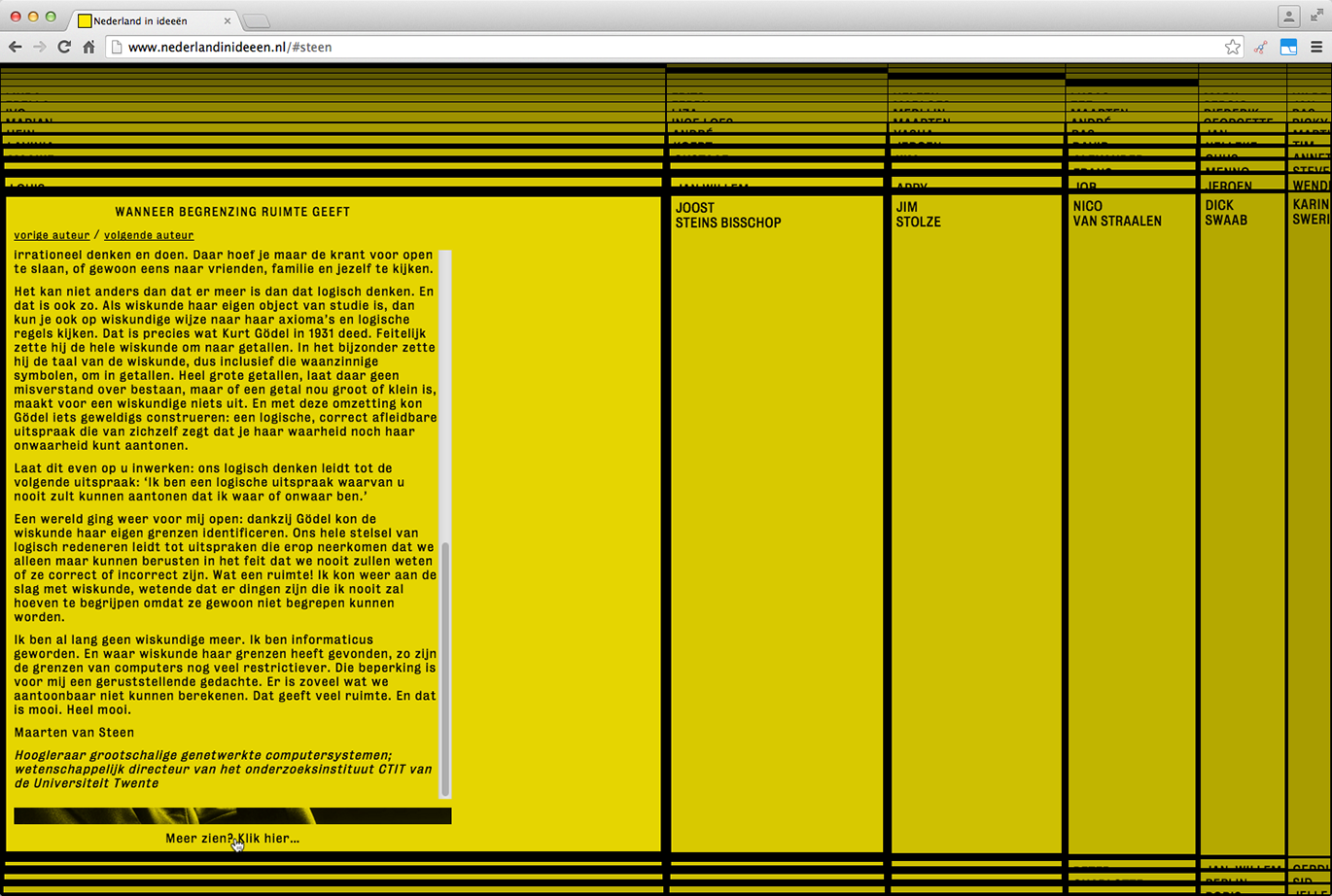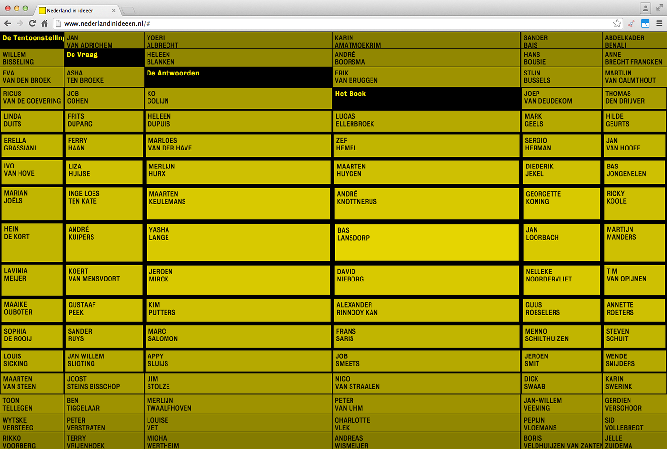 Nederland in ideeën is an online exhibition following the publication of the same name, in which 98 scientists, entrepreneurs and artists share their answer to the question “What is the most beautiful thing you’ve ever seen?”. It offers free access to the entire content of the book and contextualizes the discussed topics through supplementary images and hyperlinks.