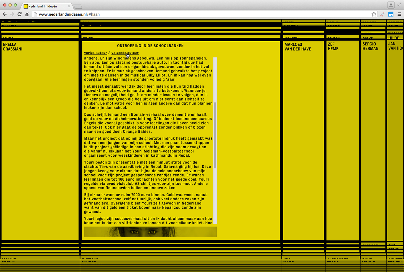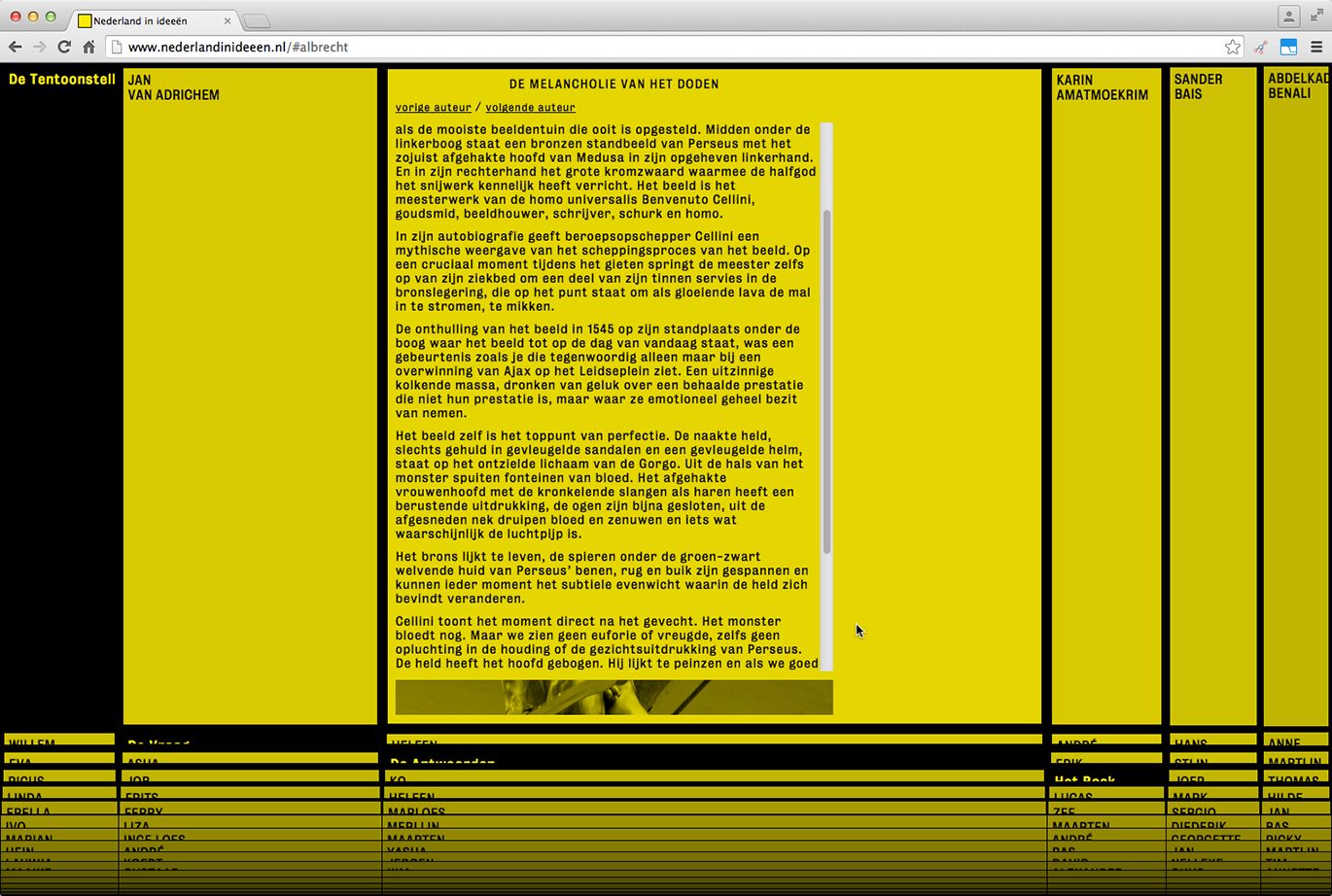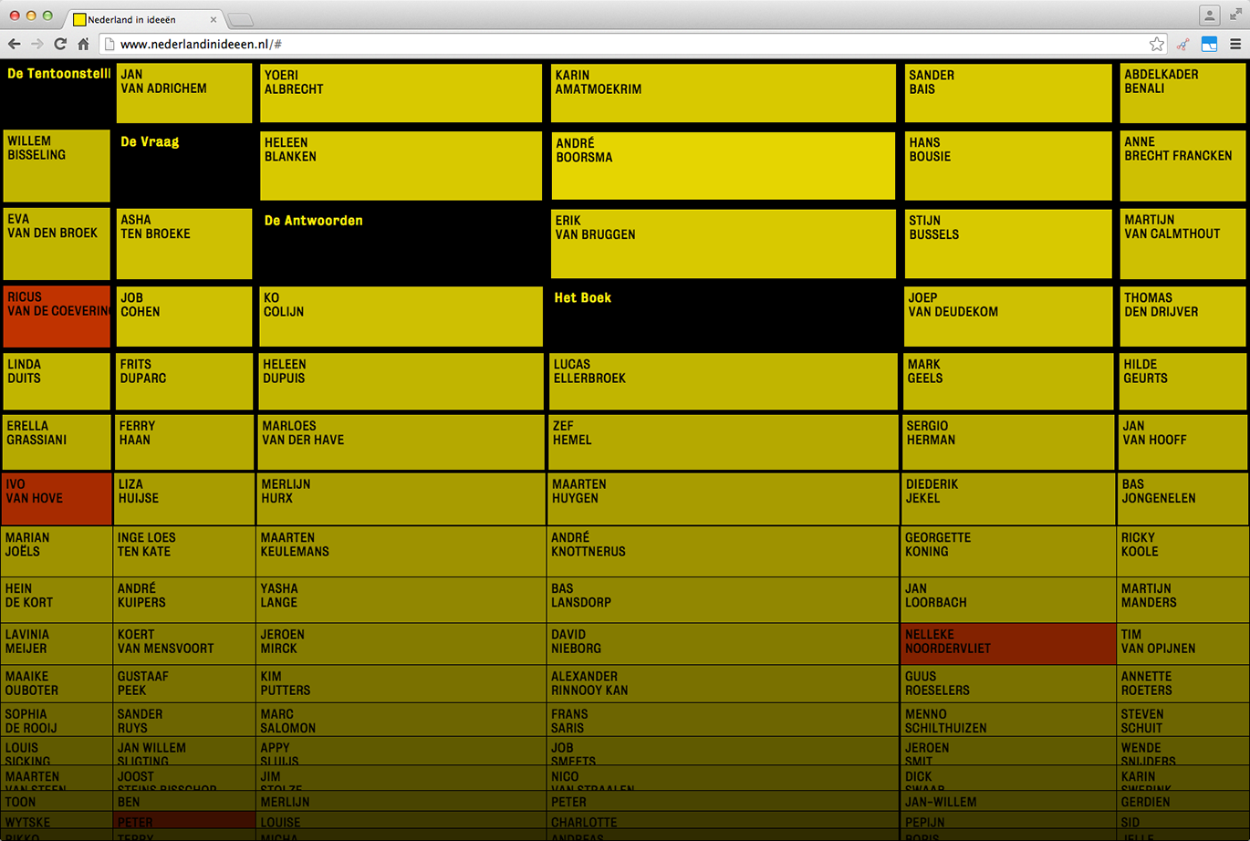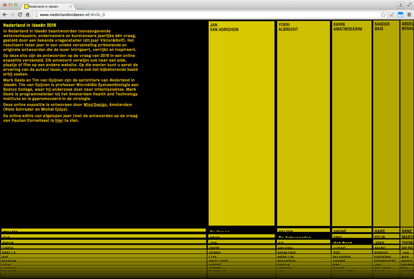 Nederland in ideeën is an online exhibition following the publication of the same name, in which 98 scientists, entrepreneurs and artists share their answer to the question “What is the most beautiful thing you’ve ever seen?”. It offers free access to the entire content of the book and contextualizes the discussed topics through supplementary images and hyperlinks.