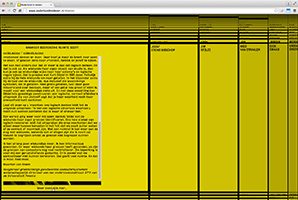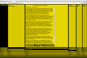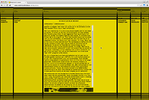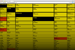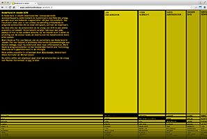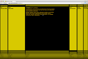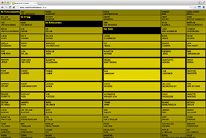 The design presents a grid of 102 tiles, one for each of the authors and 4 special ones for navigation. The grid is dynamic and reacts to the position of the cursor by resizing its elements to always magnify one object in focus. Each content tile serves as a catalog card that expands through clicking in order to expose the article and related imagery. Additionally, the visitor can filter the tiles according to categories.