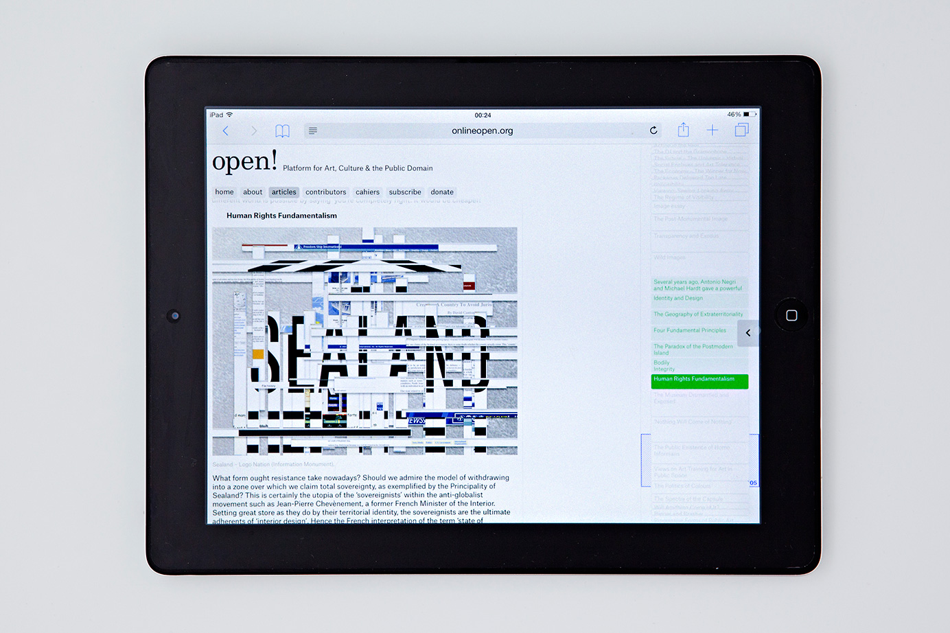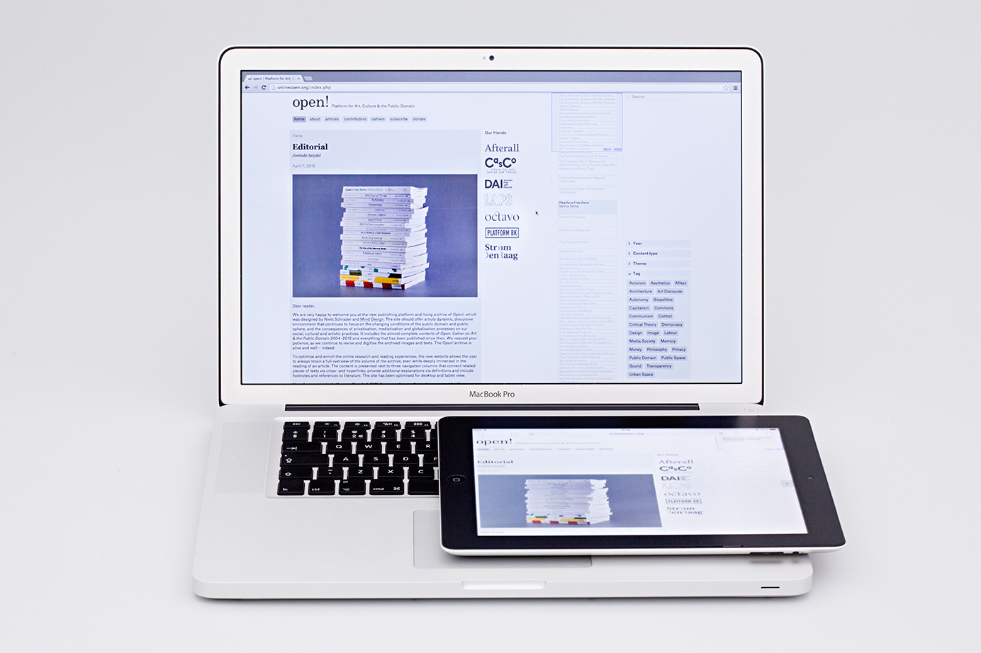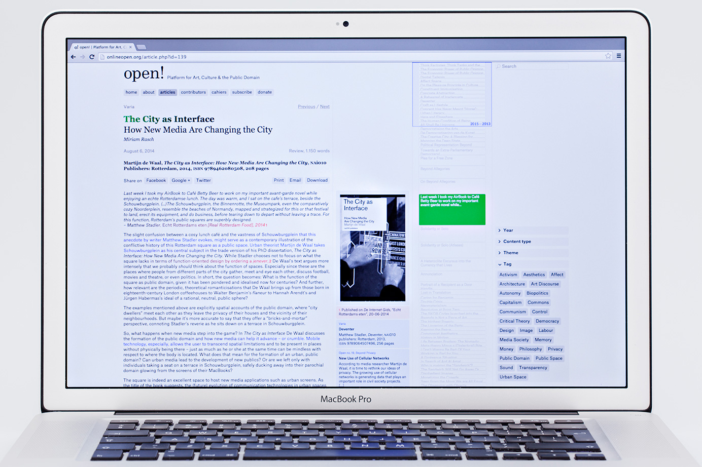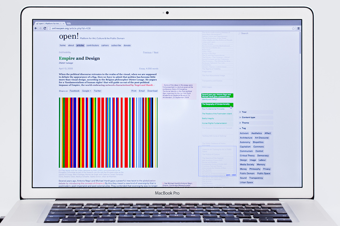 The digital catalogue Open! Platform for Art, Culture & the Public Domain is a new online environment that continues the discursive tradition of the Open cahiers published by SKOR – Foundation for Art and Public Domain. It investigates the changing conditions of the public sphere, and the consequences of privatization, mediatization and globalization processes on social, cultural and artistic practices. The archive includes the complete printed issues from 2004 to 2012 and everything that has been published since then.