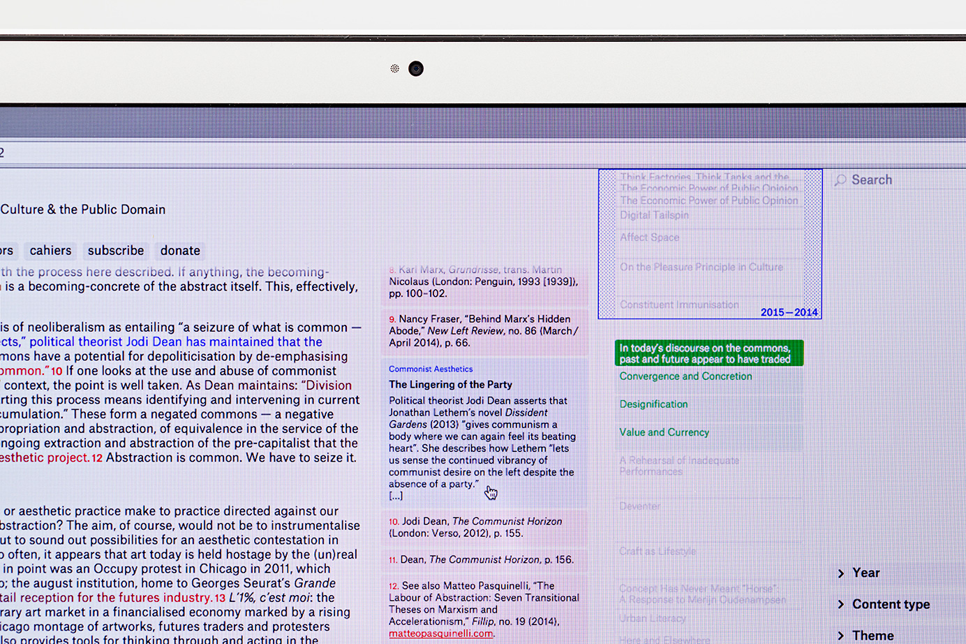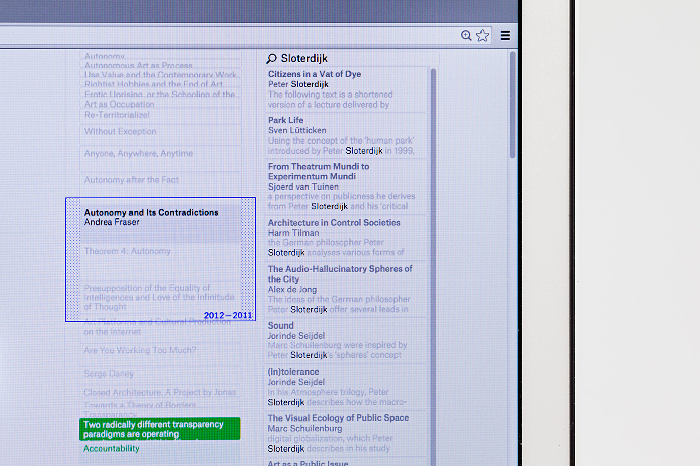 Readers can filter the articles by year, content type, theme and / or tag. Alternatively, they can browse chronologically through the entire timeline. Search function and contributors list, on the other hand, will work best for the more informed visitor. The site has been developed for desktop and tablet view.