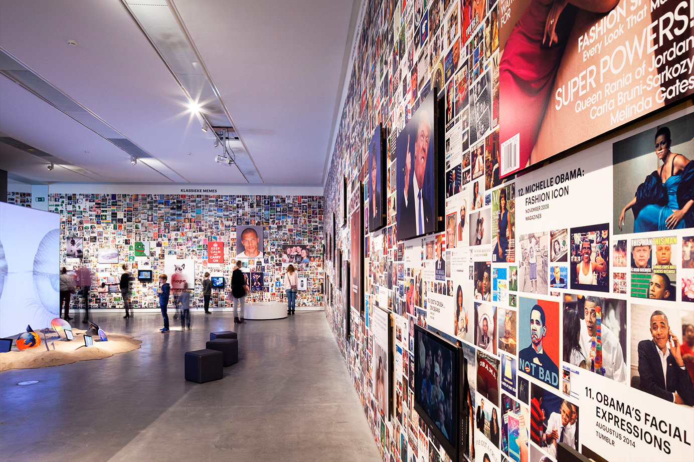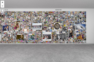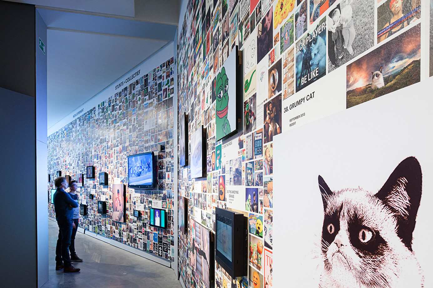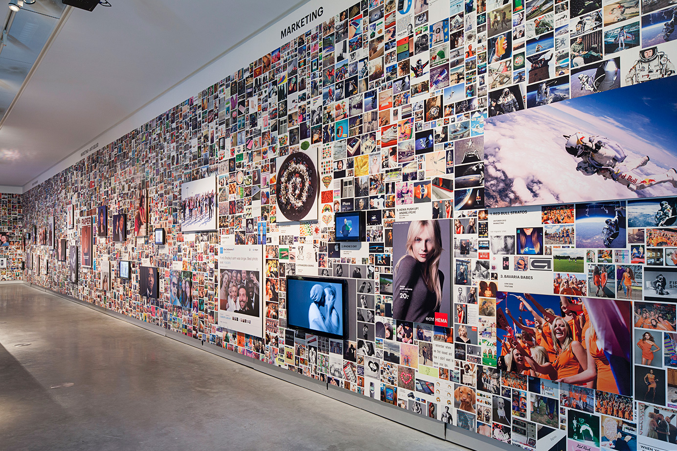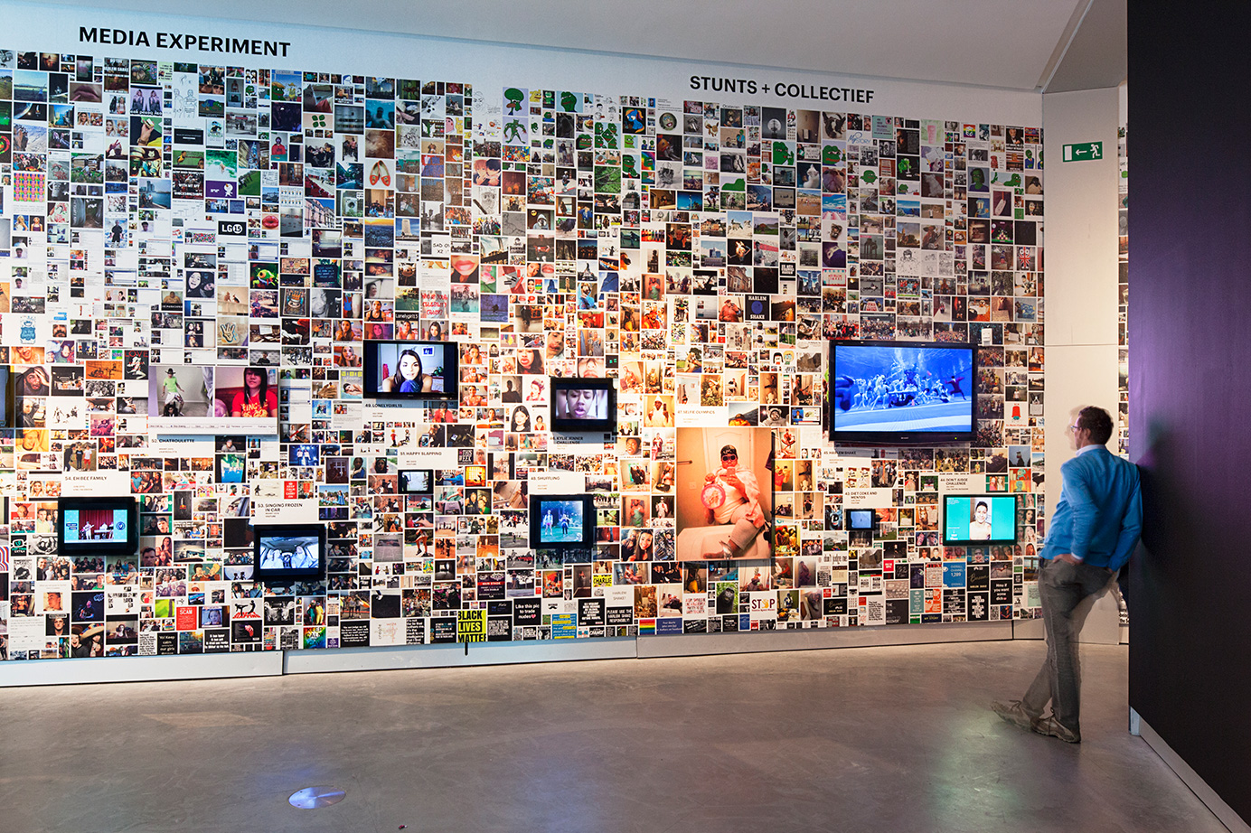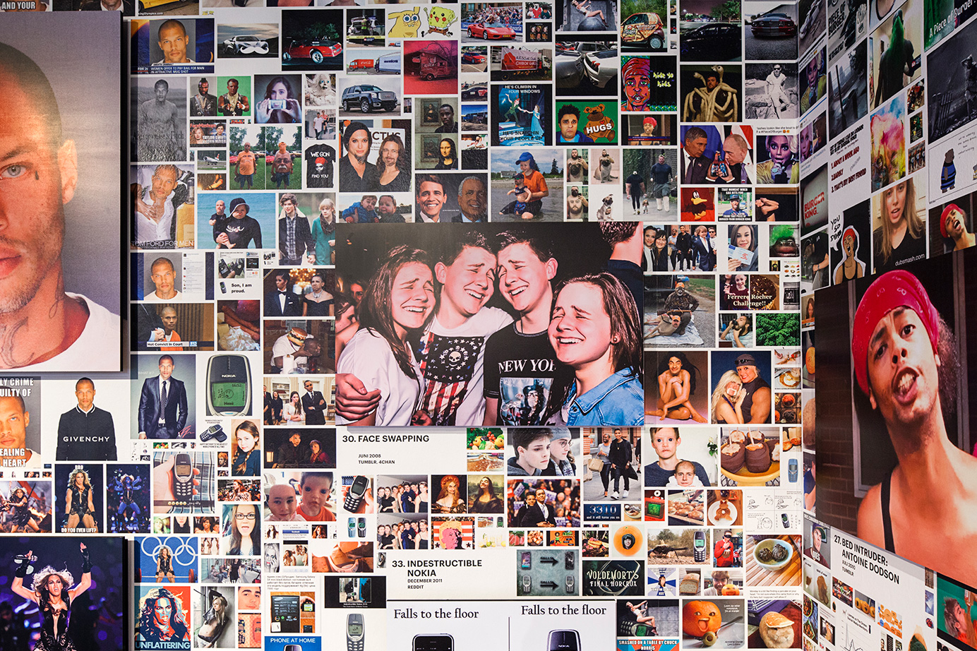 A wall surrounding the actual exhibition space creates a sense of controlled serendipity by presenting 71 hypes embedded in their various modifications. A surface of 60 x 4,4 meters is covered by a total of 8.681 images that gravitate towards one another and form clusters of associations. In their centers, the source material that started the hypes is exhibited, and takes the form of a large TV screen or a panel.