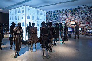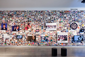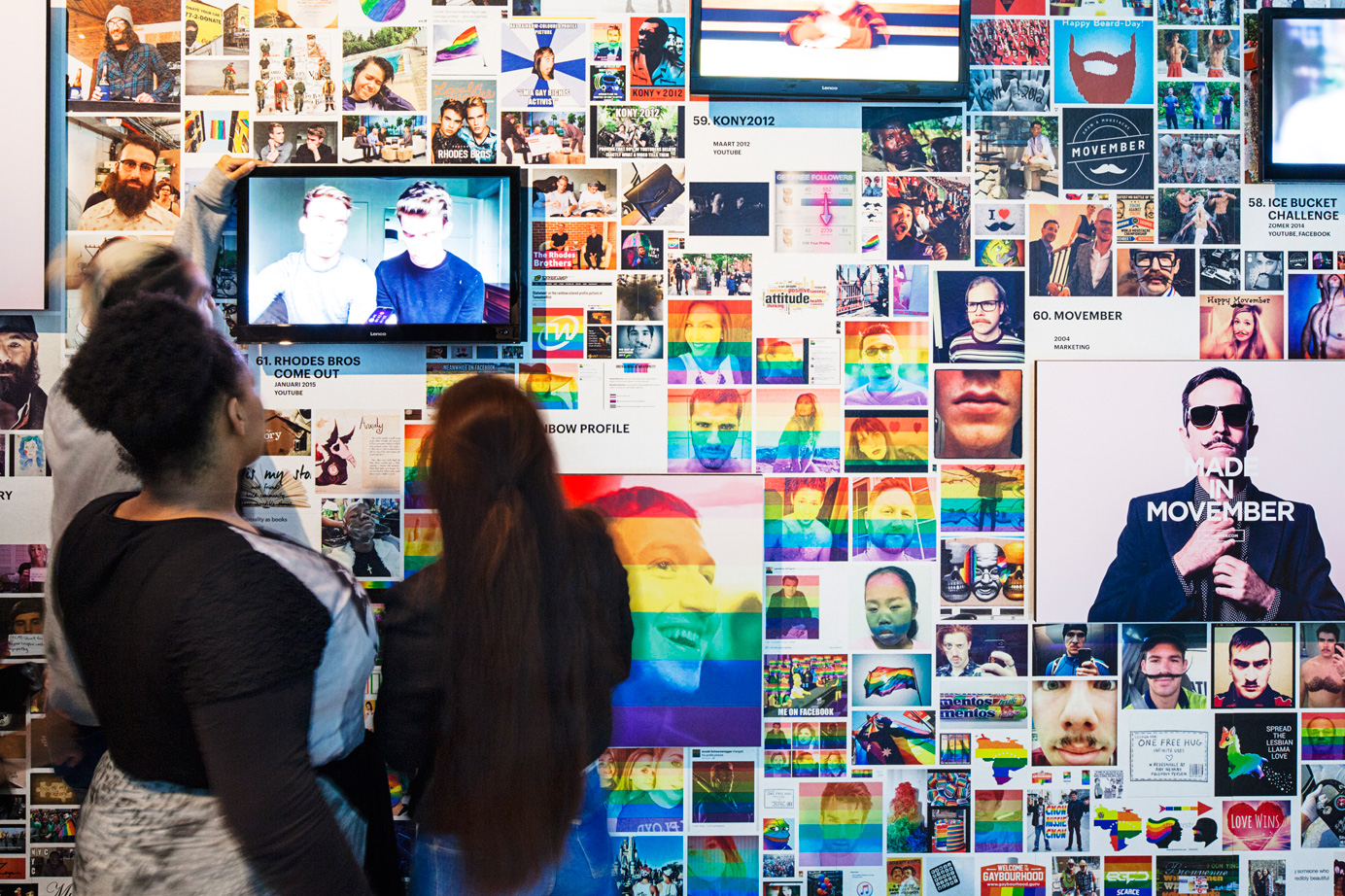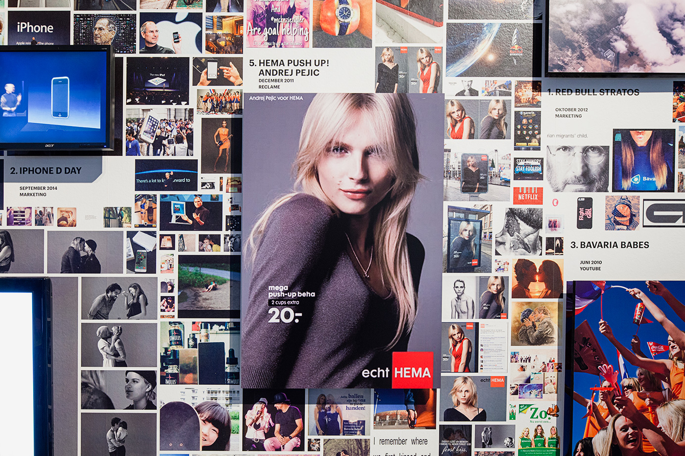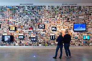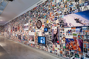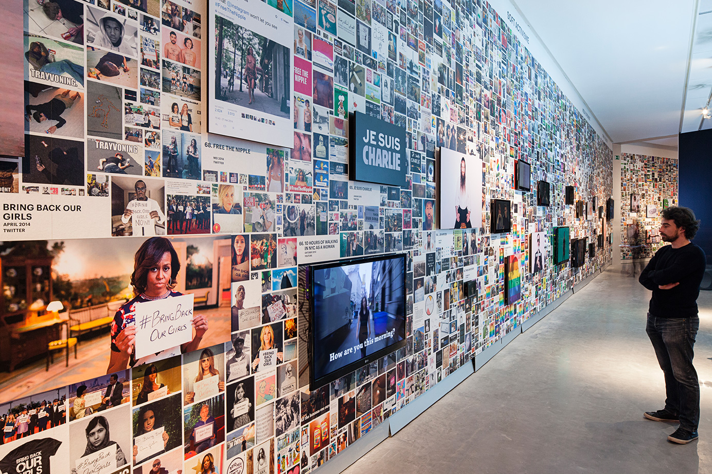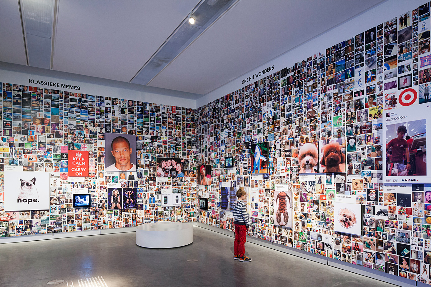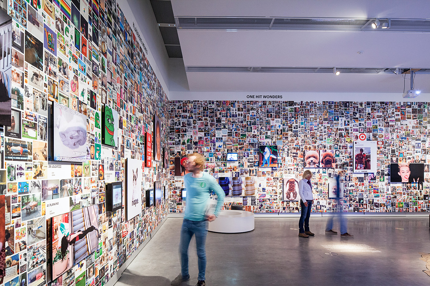 A wall surrounding the actual exhibition space creates a sense of controlled serendipity by presenting 71 hypes embedded in their various modifications. A surface of 60 x 4,4 meters is covered by a total of 8.681 images that gravitate towards one another and form clusters of associations. In their centers, the source material that started the hypes is exhibited, and takes the form of a large TV screen or a panel.