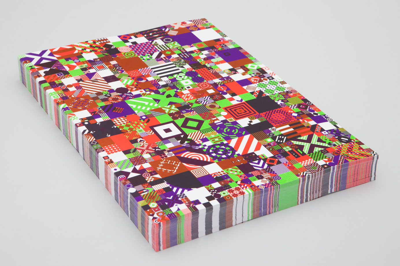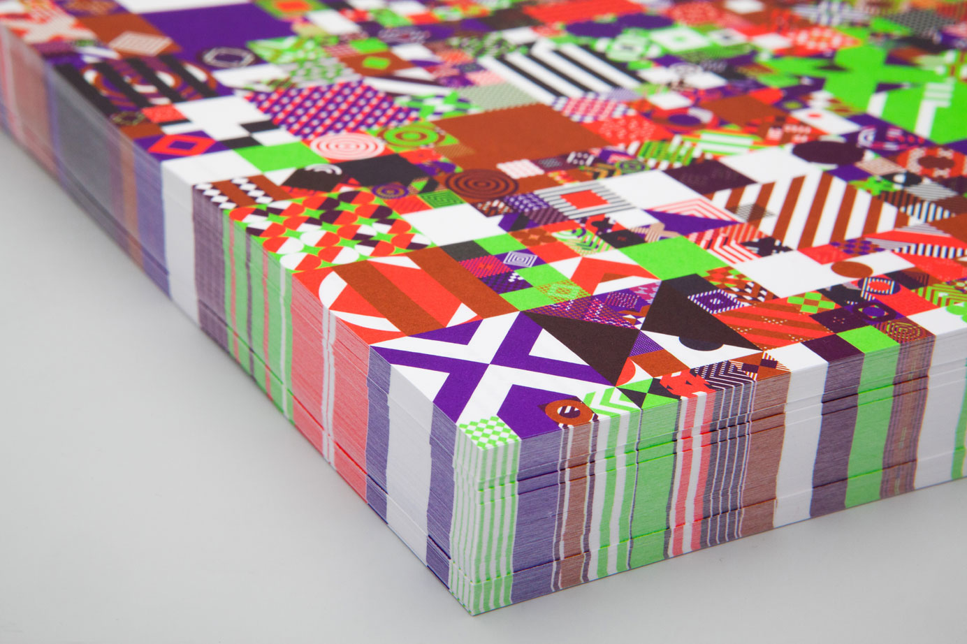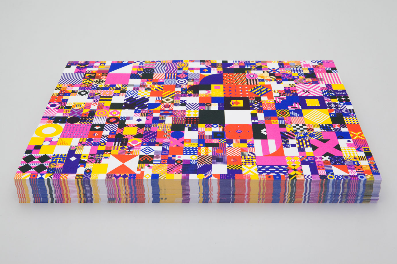 The result is a kaleidoscopic pattern created by a computer algorithm that assembles a number of shapes and colors into a grid of unique cells with various sizes. All the individual shapes and styles derive from numerous medieval shield patterns and were carefully adapted to match the scaling. With its deeply saturated colors, the overprint process brings to life a wide range of media including letterhead, business card and wrapping paper.