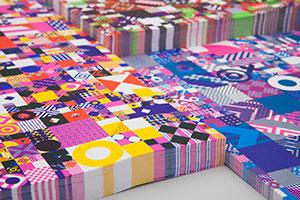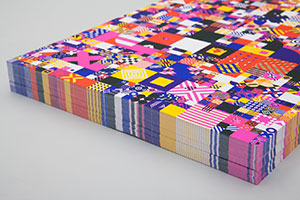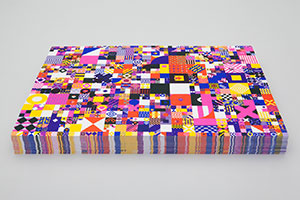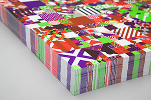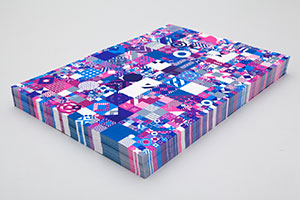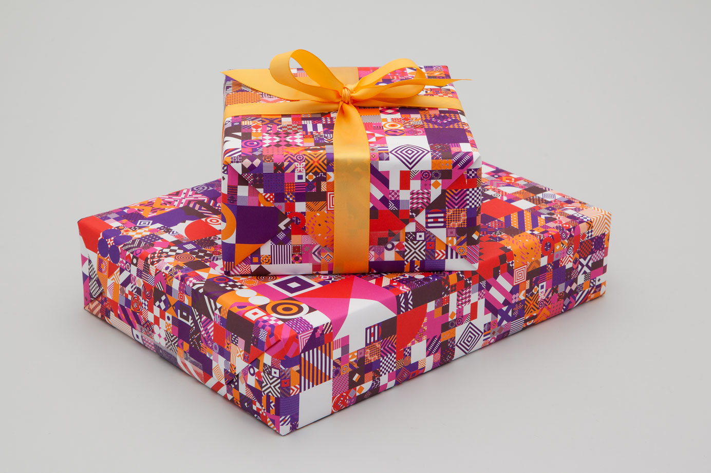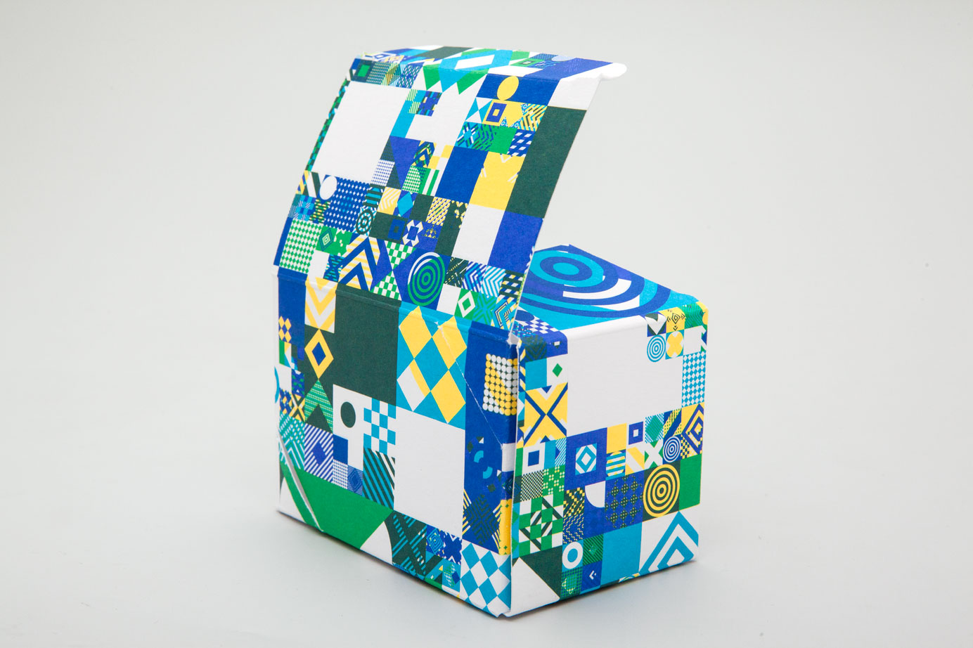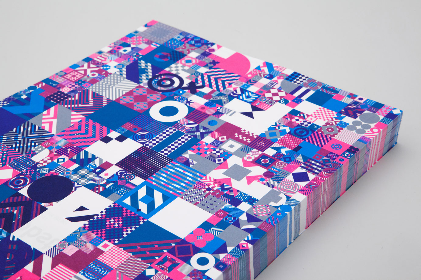 The result is a kaleidoscopic pattern created by a computer algorithm that assembles a number of shapes and colors into a grid of unique cells with various sizes. All the individual shapes and styles derive from numerous medieval shield patterns and were carefully adapted to match the scaling. With its deeply saturated colors, the overprint process brings to life a wide range of media including letterhead, business card and wrapping paper.