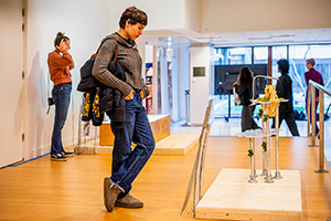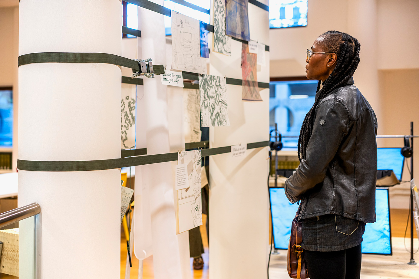 Exhibition visitor looking at Laura Flethe’s embodied and experience-based maps.