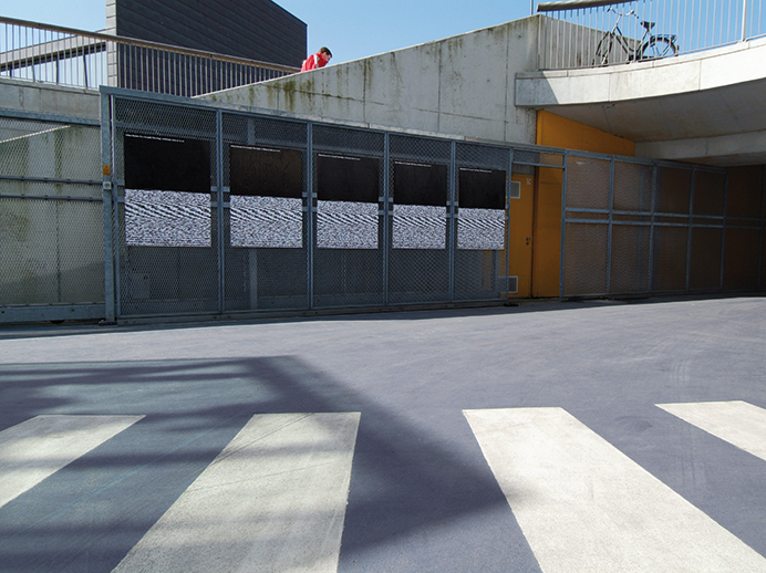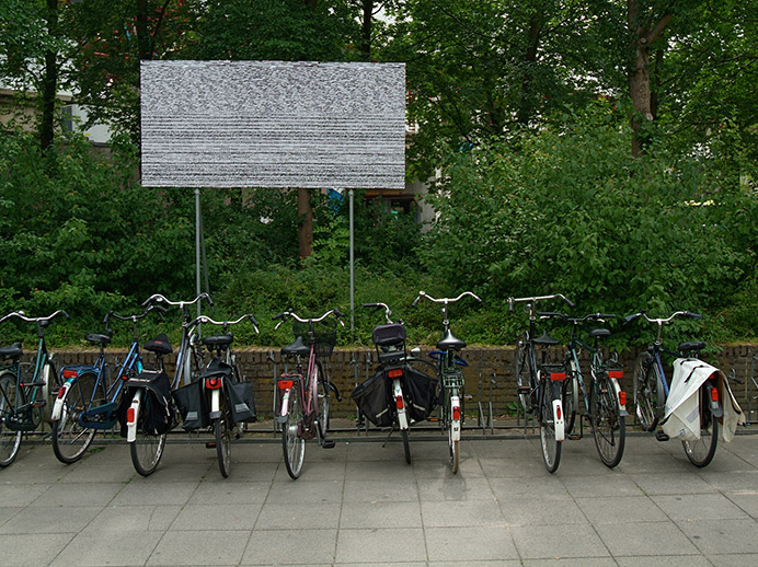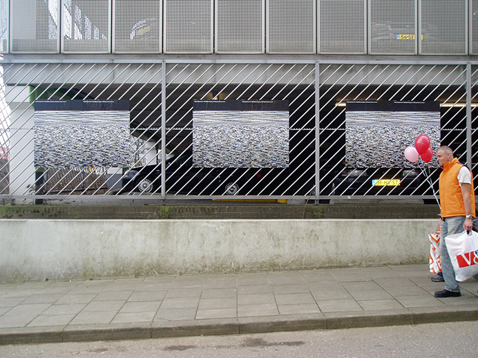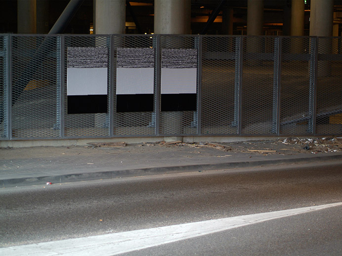 Graphic designer Niels Schrader and musician Tanja Keilen enter the public space with seven acoustic posters. For this purpose, seven outdoor locations in the new city centre of Almere were selected according to their urban significance. The site’s specific sound was recorded and subsequently filtered to obtain the acoustic essence. By finally rendering this tonal composition in an abstract computer image, the inherent visual appearance of a digital sound file is exposed.