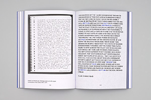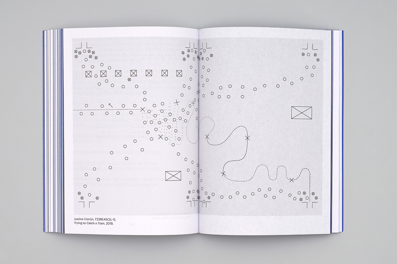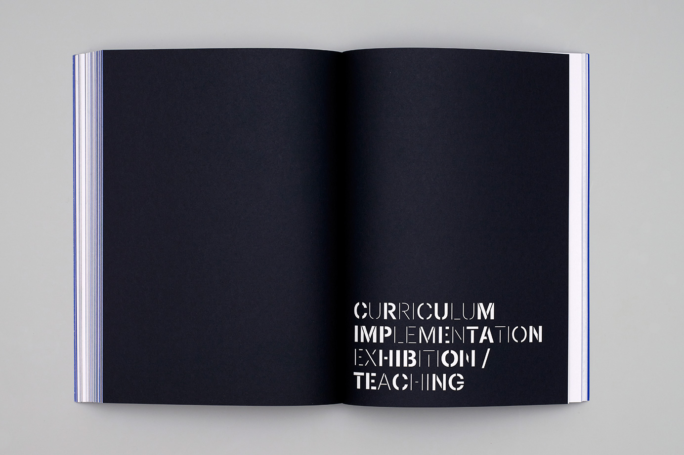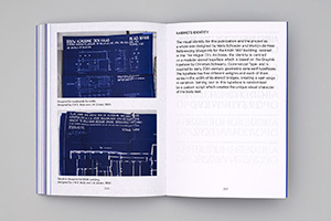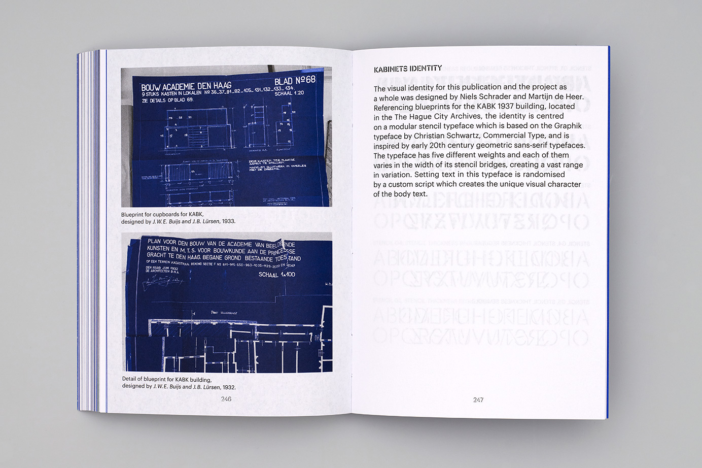 Referencing blueprints for the 1937 building of the Royal Academy of Art, the identity of the research series is centred on a modular stencil typeface which is based on the Graphik typeface by Christian Schwartz, and is inspired by early 20th century geometric sans-serif typefaces. The font has five different weights and each of them varies in the width of its stencil bridges, creating a vast range in variation. Setting text in this typeface is randomised by a custom script which creates the unique visual character of the body text.