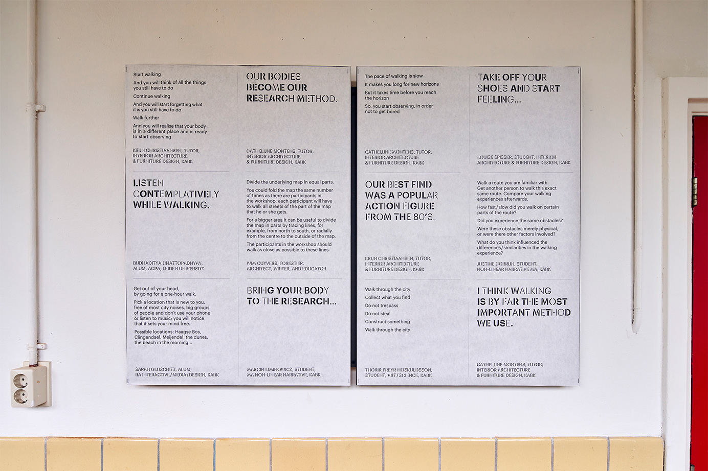 KABK Art and Design Research Practices is an initiative, through which the Lectorate Design identifies and shares a range of research methods practiced at the Royal Academy of Art (KABK) that use the tools, approaches, and capacities of art and design to create and surface new knowledge. The first edition explores the research method of walking from a design perspective, and features the working process used by public space and landscape designers Krijn Christiaansen and Cathelijne Montens (KCCM) who teach field research in BA Interior Architecture and Furniture Design at KABK.