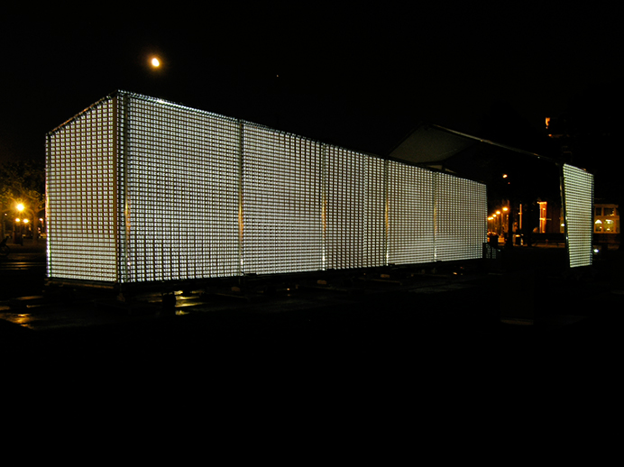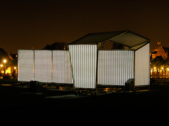 Every day at sunset, when daylight vanishes and artificial light governs our visual perception, the mobile exhibition pavilion Pleinmuseum unfolds its 156 square meters projection surface to become a temporary art screen in urban environment.