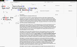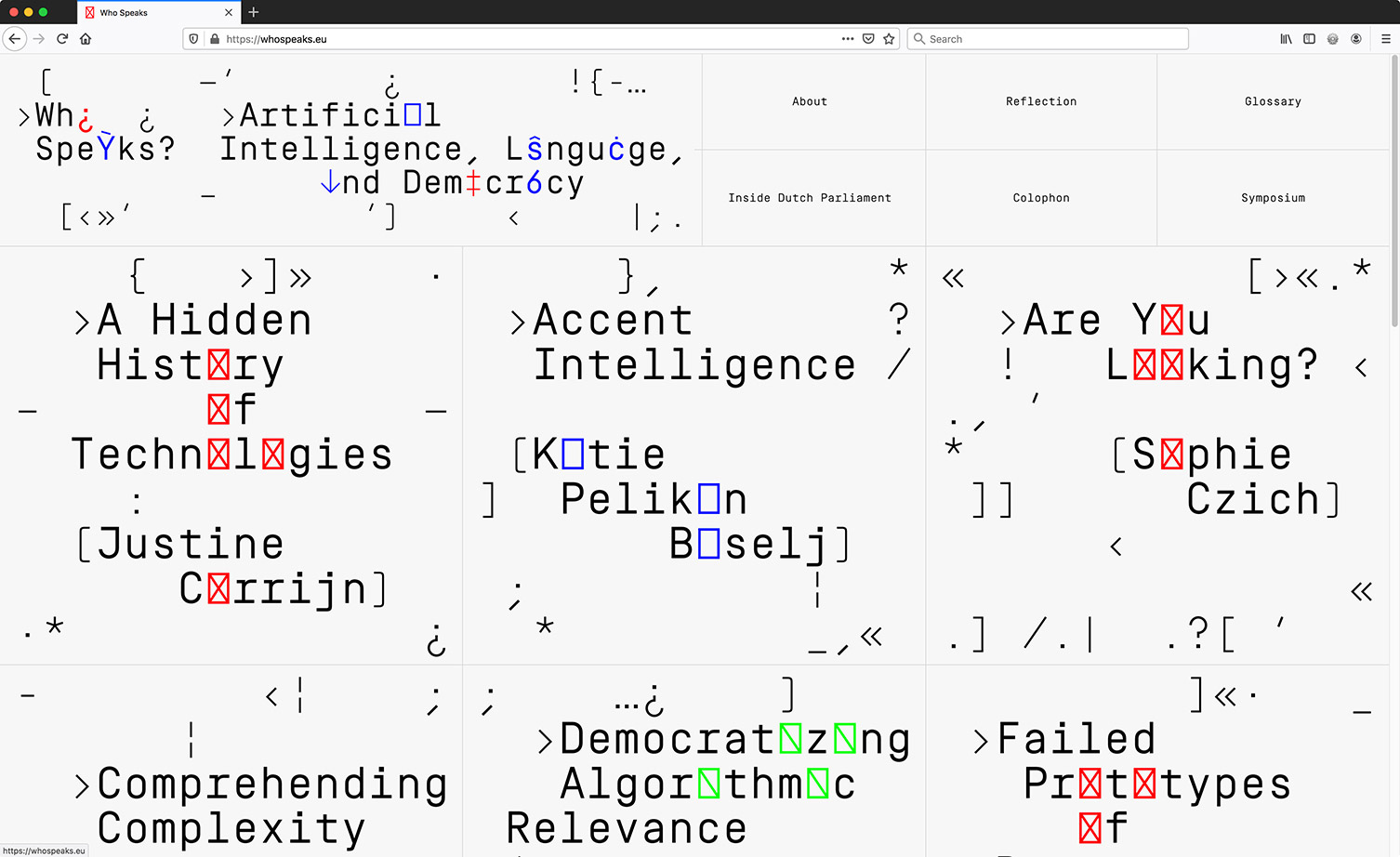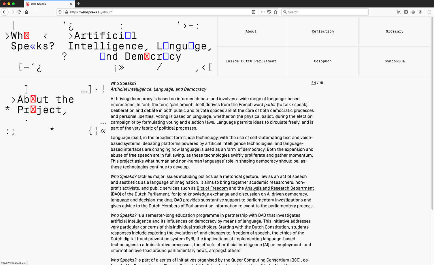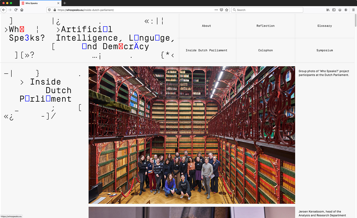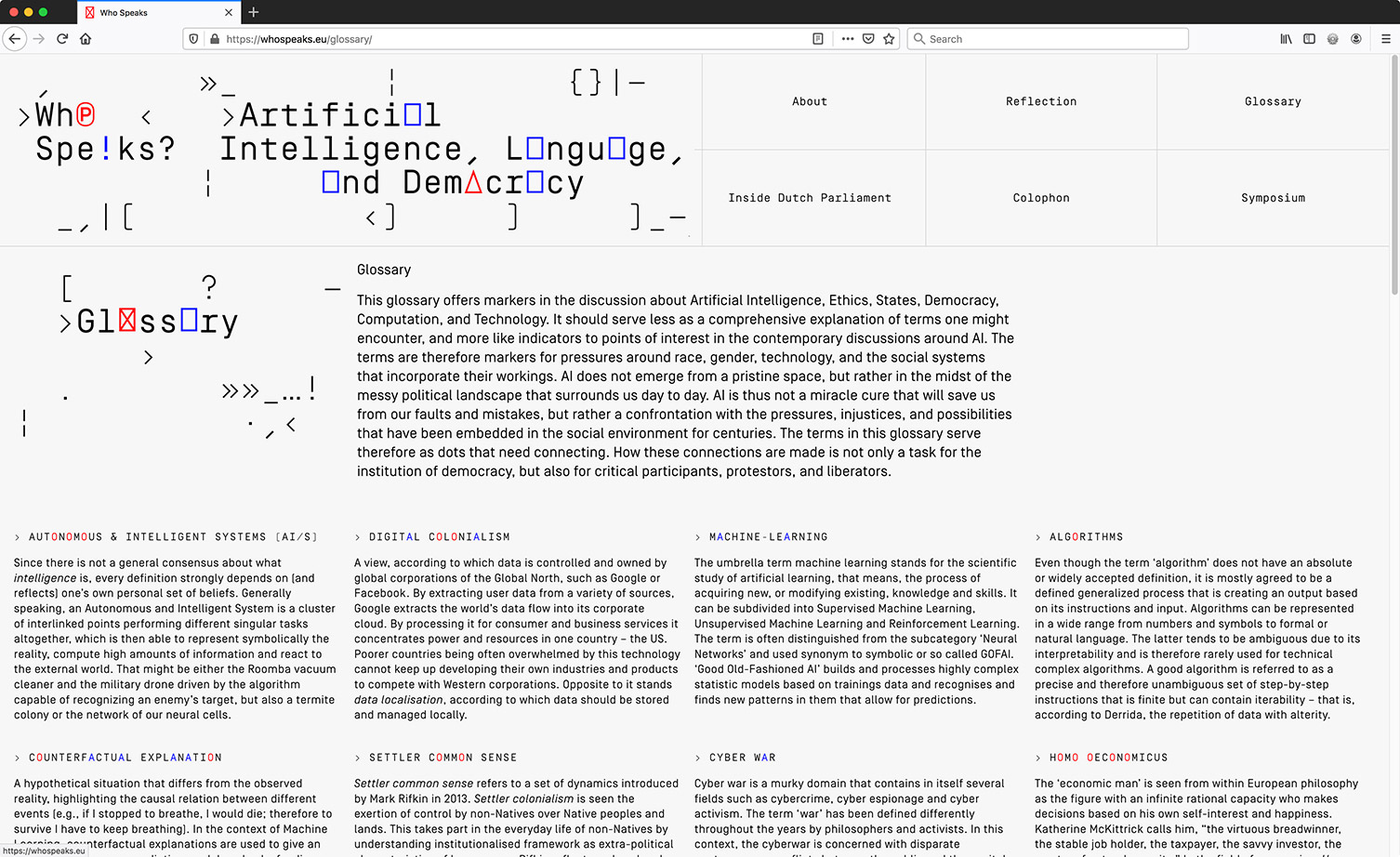 Who Speaks? Artificial Intelligence, Language, and Democracy was a semester-long educational programme which took place in 2020 in partnership with the Analysis and Research Department (DAO) of the Dutch Parliament that investigated artificial intelligence and its influences on democracy by means of language. The project collaboration was initiated by the Non Linear Narrative Master’s programme of the Royal Academy of Art, The Hague, Goldsmiths (University of London) and Camberwell College of Arts (CCW / University of the Arts London). It tackled major issues including politics as a rhetorical gesture, law as an act of speech and aesthetics as a language of imagination.